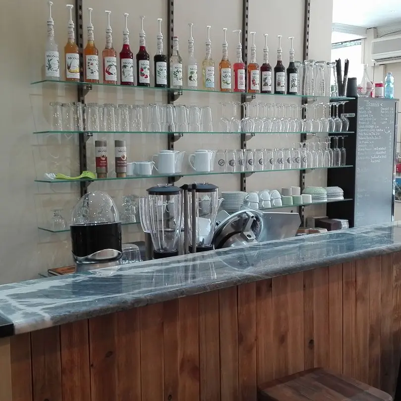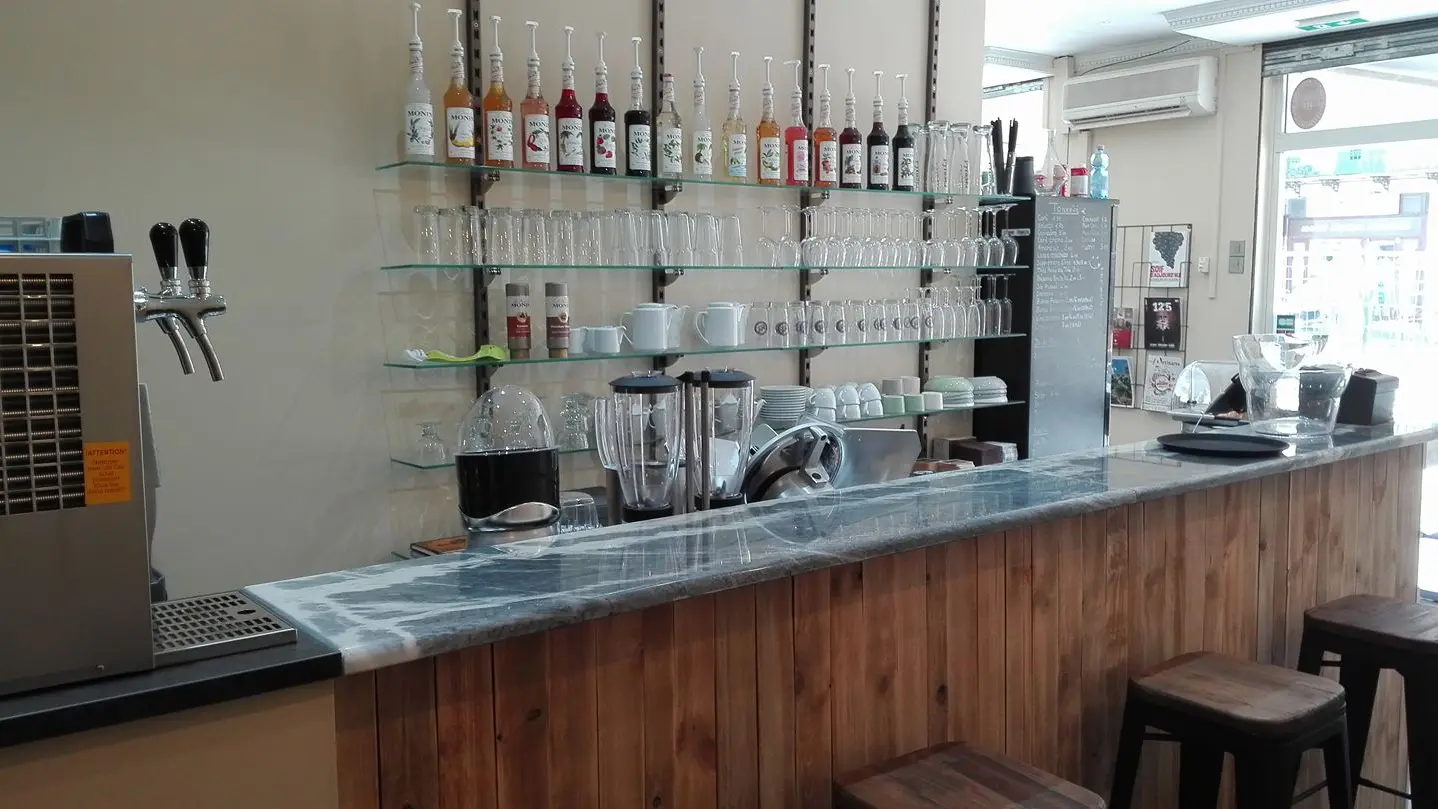 Wine bar, a wide selection of beers on offer, bio fruit juice. Natural ice cream flavours, charcuterie board, organic cheese.