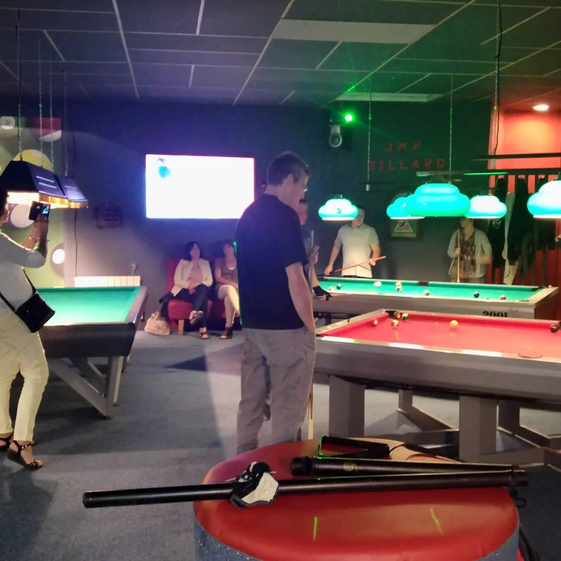 Billiard room with American billiards and pools, table football, darts, pinball and catering. Organization of concerts on weekends. Air-conditioned room.