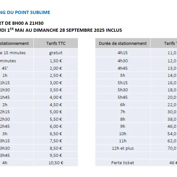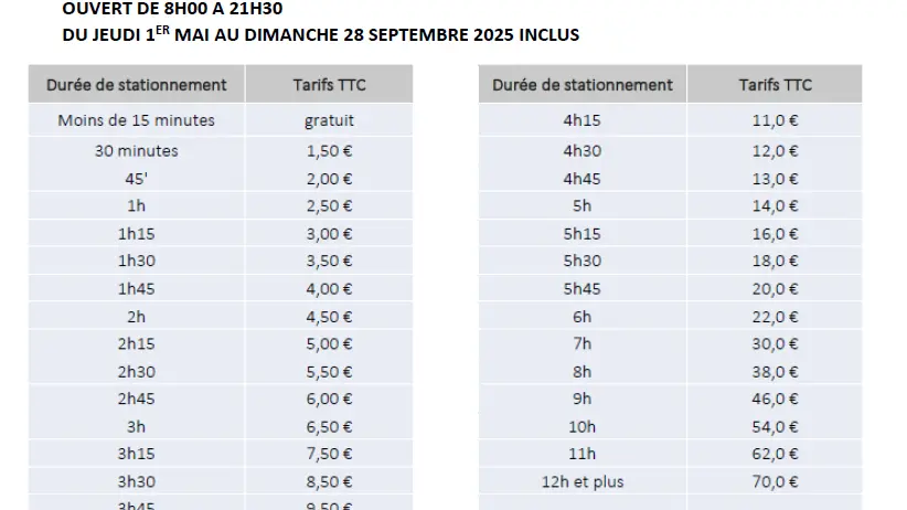 The parking lot is open from 8 a.m. to 8 p.m. every day during the high season, and free access the rest of the year.