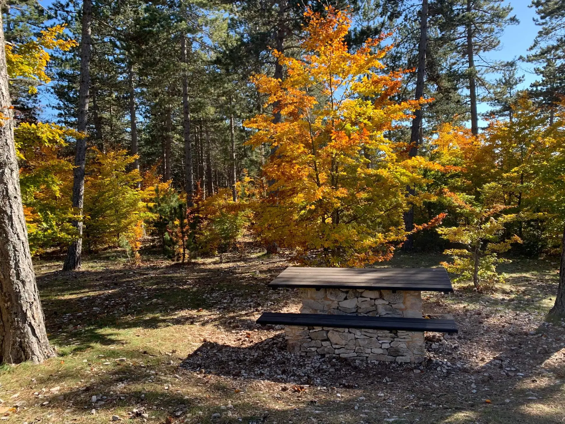 At the start of the Ventoux wildlife trail (approx. 2km), shaded picnic table. Parking along the RD164, near the recycled metal deer sculpture. Ideal for a picnic followed by a family outing.