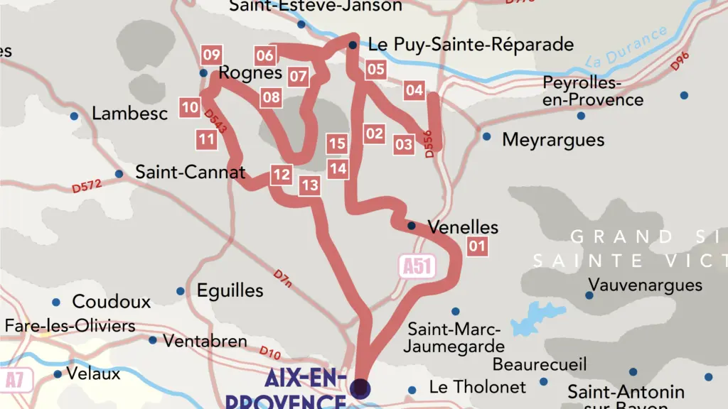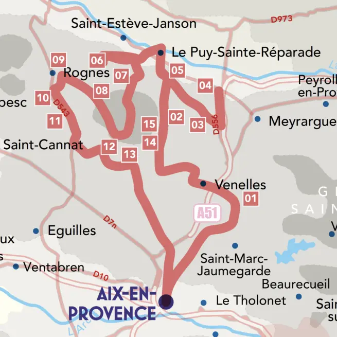 Take the RD13a in the direction of Venelles le Haut. Cross the village in direction of the road of Saint Canadet - RD13.