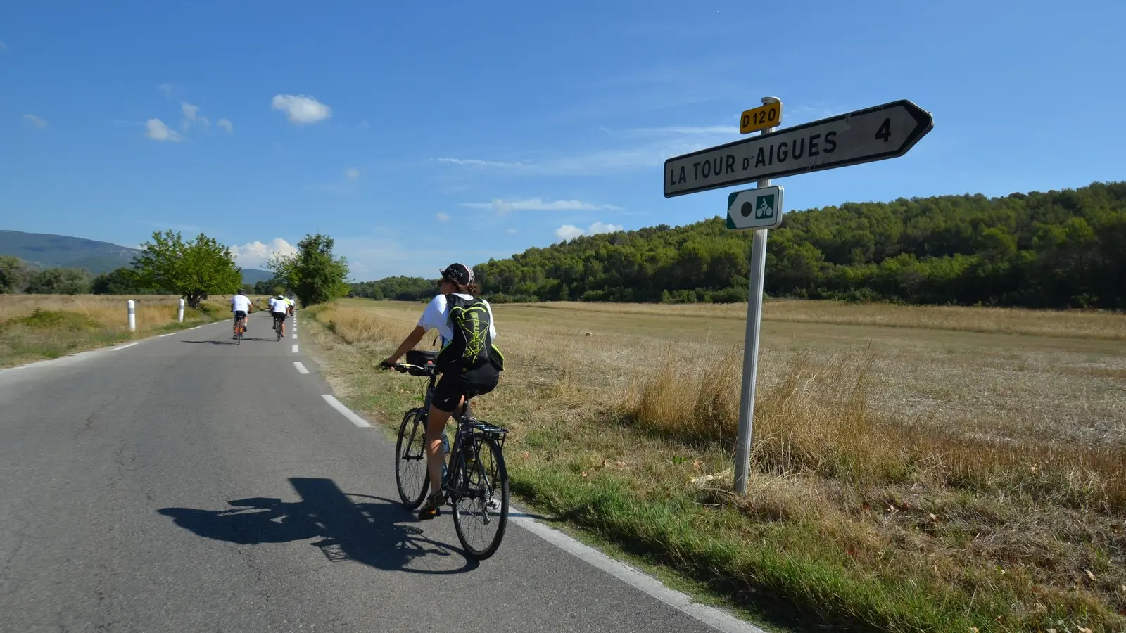 Back to the castle and the tourist office, take on the right the bd de la République (D956). 180 m later, turn left into a protected passage (bike sign "Liaison La-Tour-d'Aigues-Saint-Martin-de-la-Brasque"). Go past the college. At the next roundabout, turn right onto Chemin du Piedmont. Further on, join the D120 and take the right for 200 m.