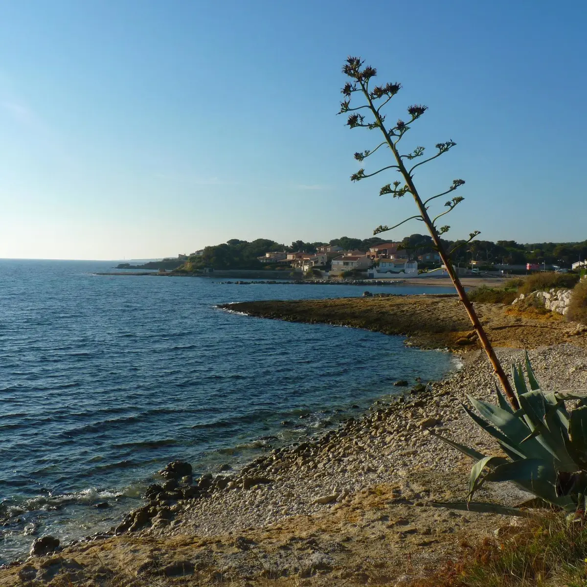 Leave the D5 at the Carry-le-Rouet entrance sign and the plage des Baumettes. Still on the GR, follow the coastal path along the "piste du Lézard", which runs pleasantly alongside the sea to the port of Carry. This educational trail, part of the Côte Bleue regional marine park, features 10 information points on a variety of themes (aquatic flora and fauna, plants, shrubs, erosion, fossils, cicadas and green lizards), and is sure to amaze you! Magnificent views over the Côte Bleue to Marseille. After the pretty little red-and-white lighthouse and the inviting sandy coves perfect for swimming, arrive at the port of Carry via the Quai Malleville and walk past the Casino Municipal. Turn left onto Avenue Aristide Briand and pass the Espace Fernandel cinema. Take the yellow route along the boulodrome to the railway station.