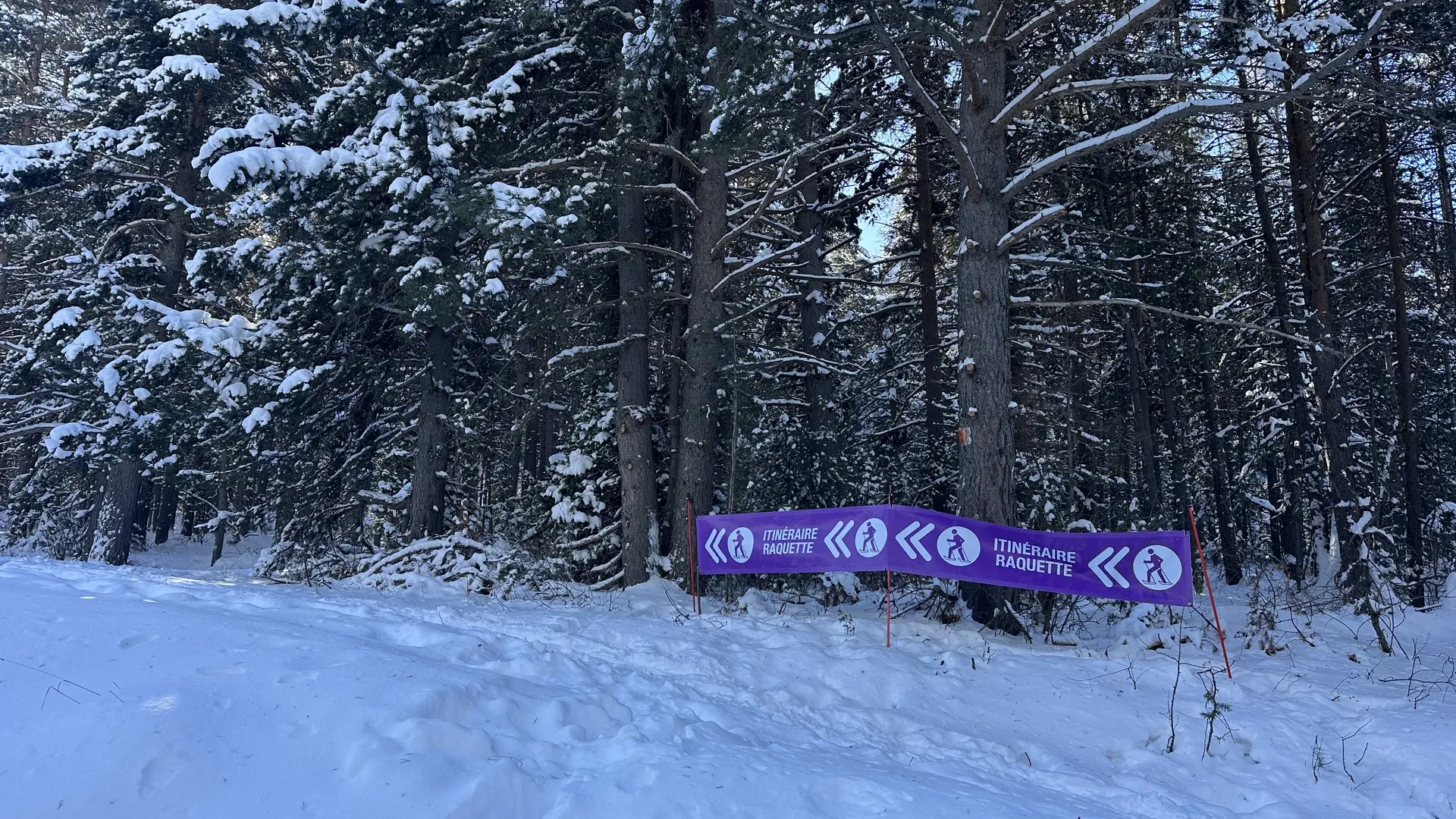 After about 800m, the route crosses the cross-country ski trail and enters the forest below. Do not take the ski trail, but follow the snowshoe markings.