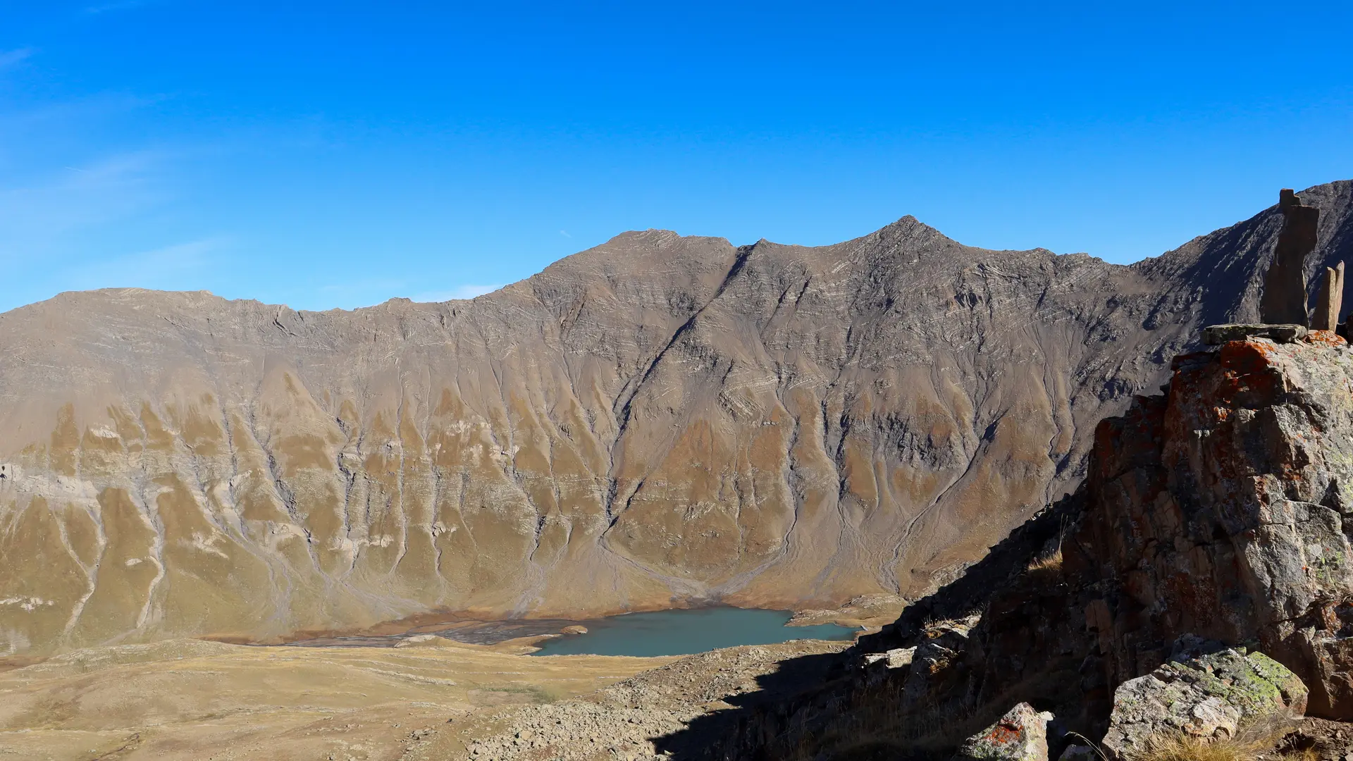 The descent to the refuge and lake takes place on the other side (east), over grassy slopes cut by small rocky outcrops.