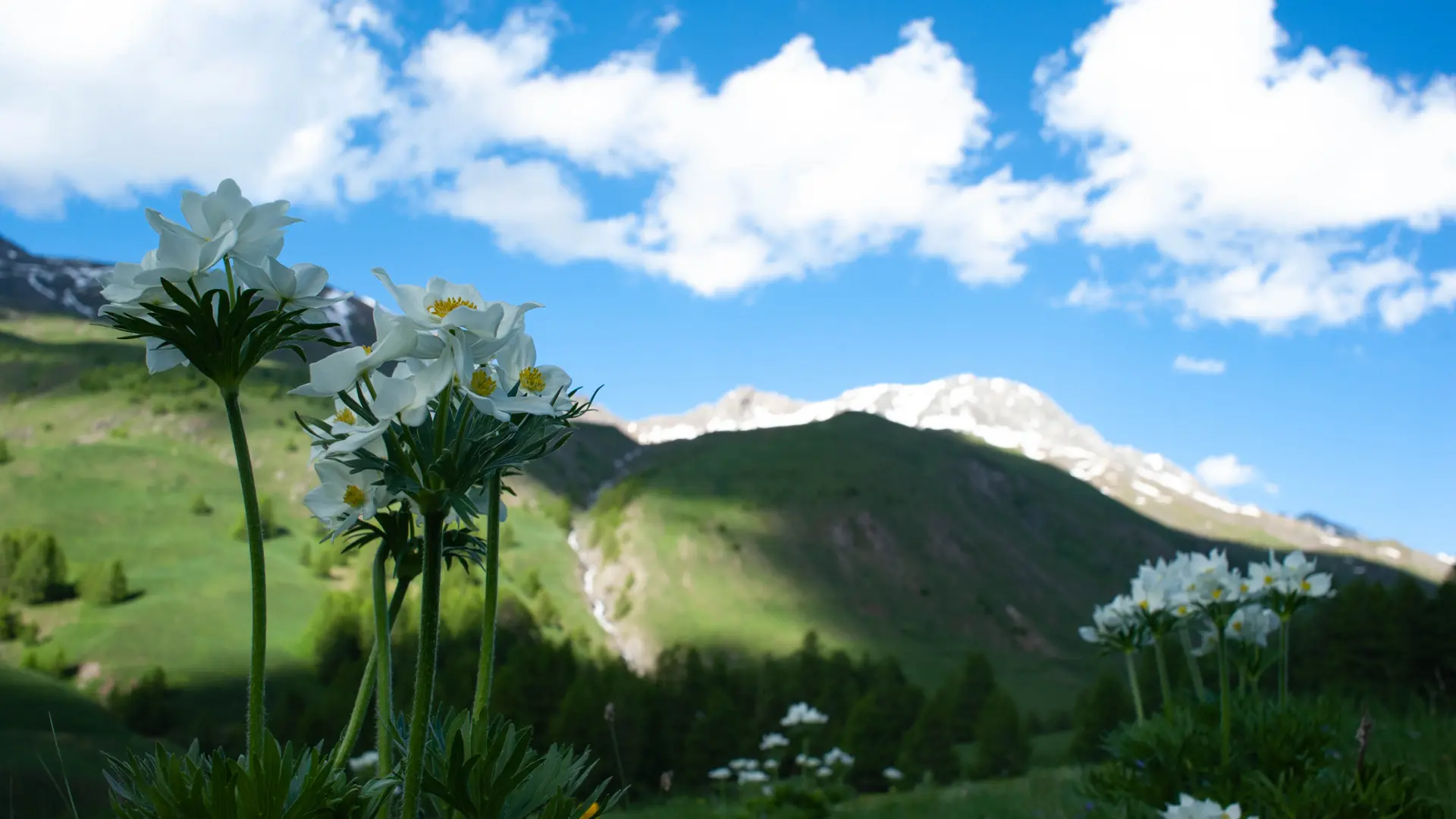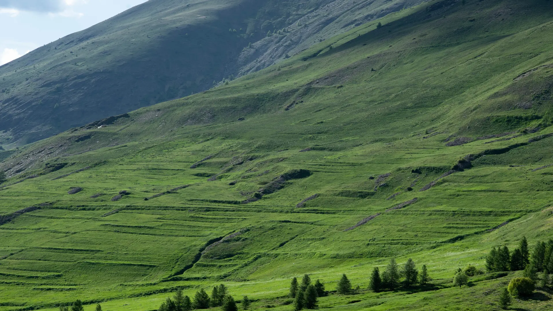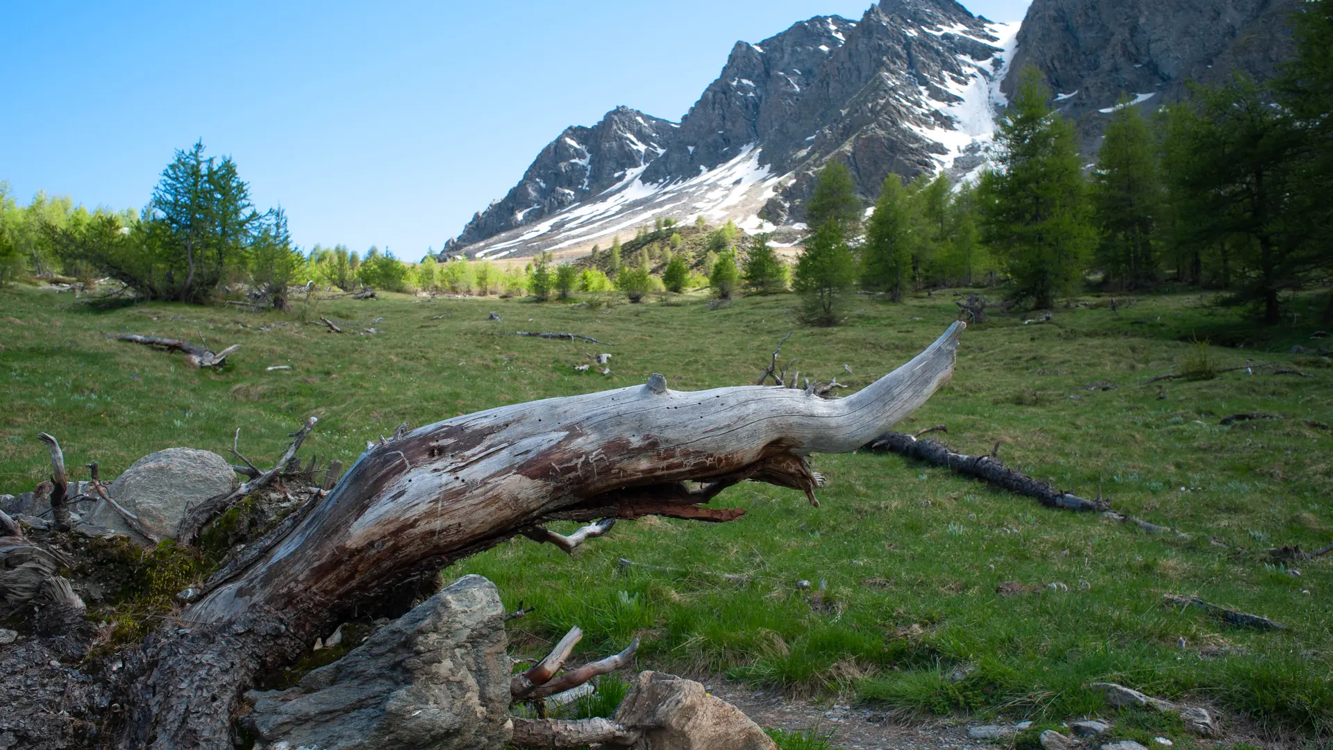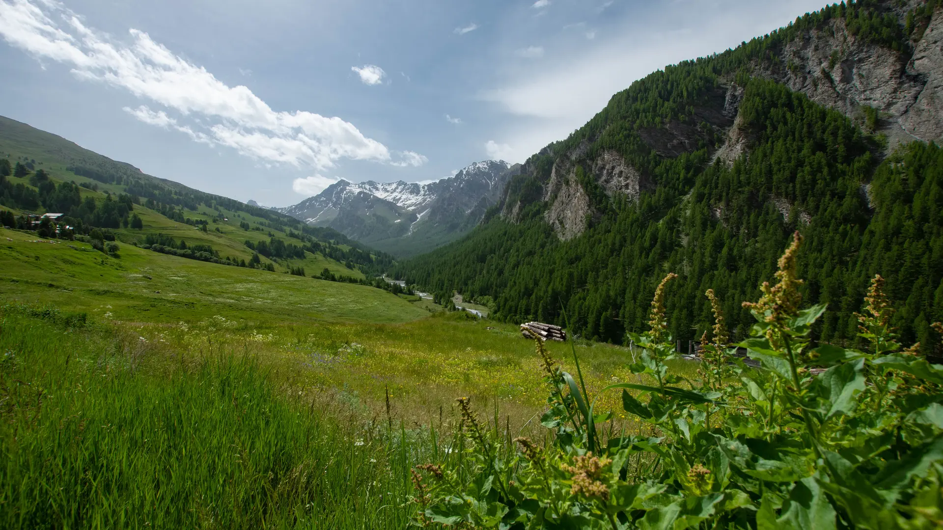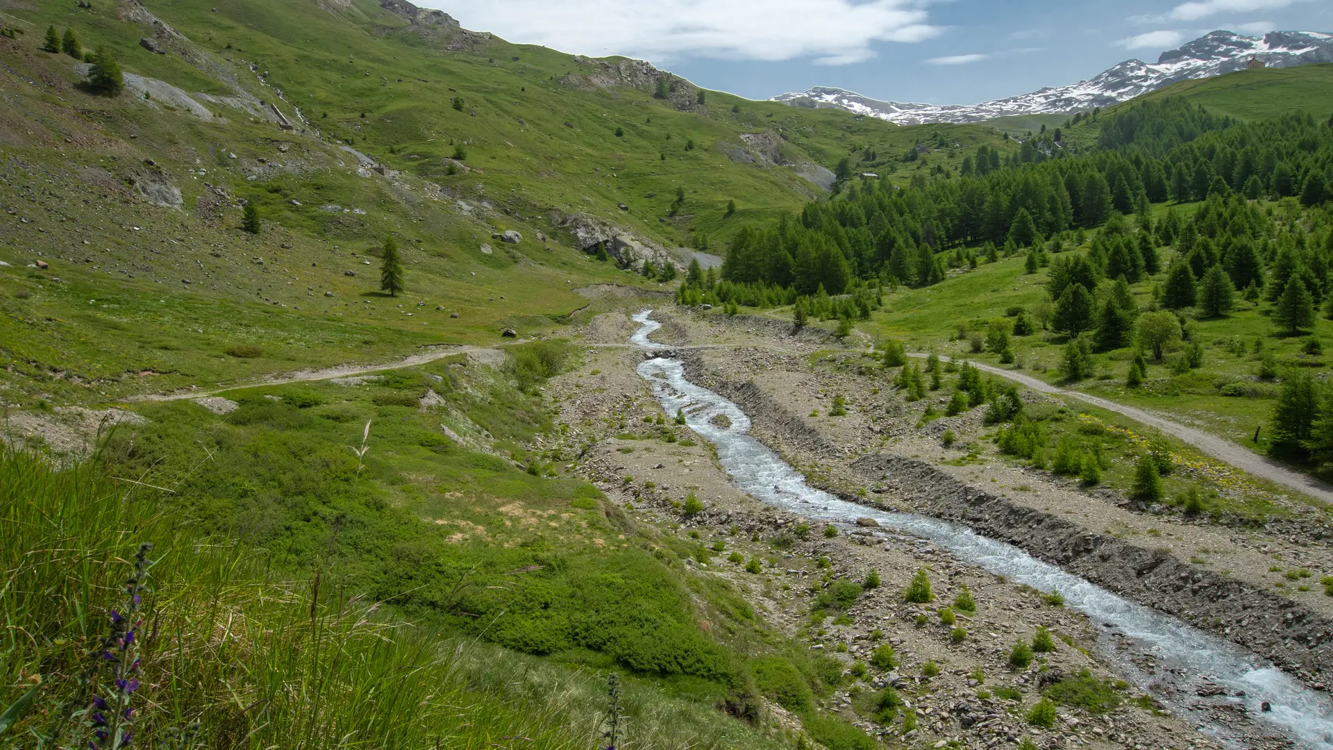 From level to level, the path climbs up the torrent: "la vallée de l'Aigue Blanche" (1953 m). This is a perfect example of the contrast between the sunny, alpine-covered adret slopes and the north-facing ubac, colonized by a larch forest.