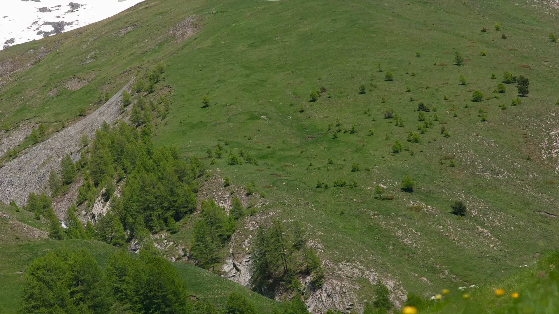 In the heart of the larches, I turn around the mountain to find myself in the other parallel valley, the Val d'Aigue Agnelle.