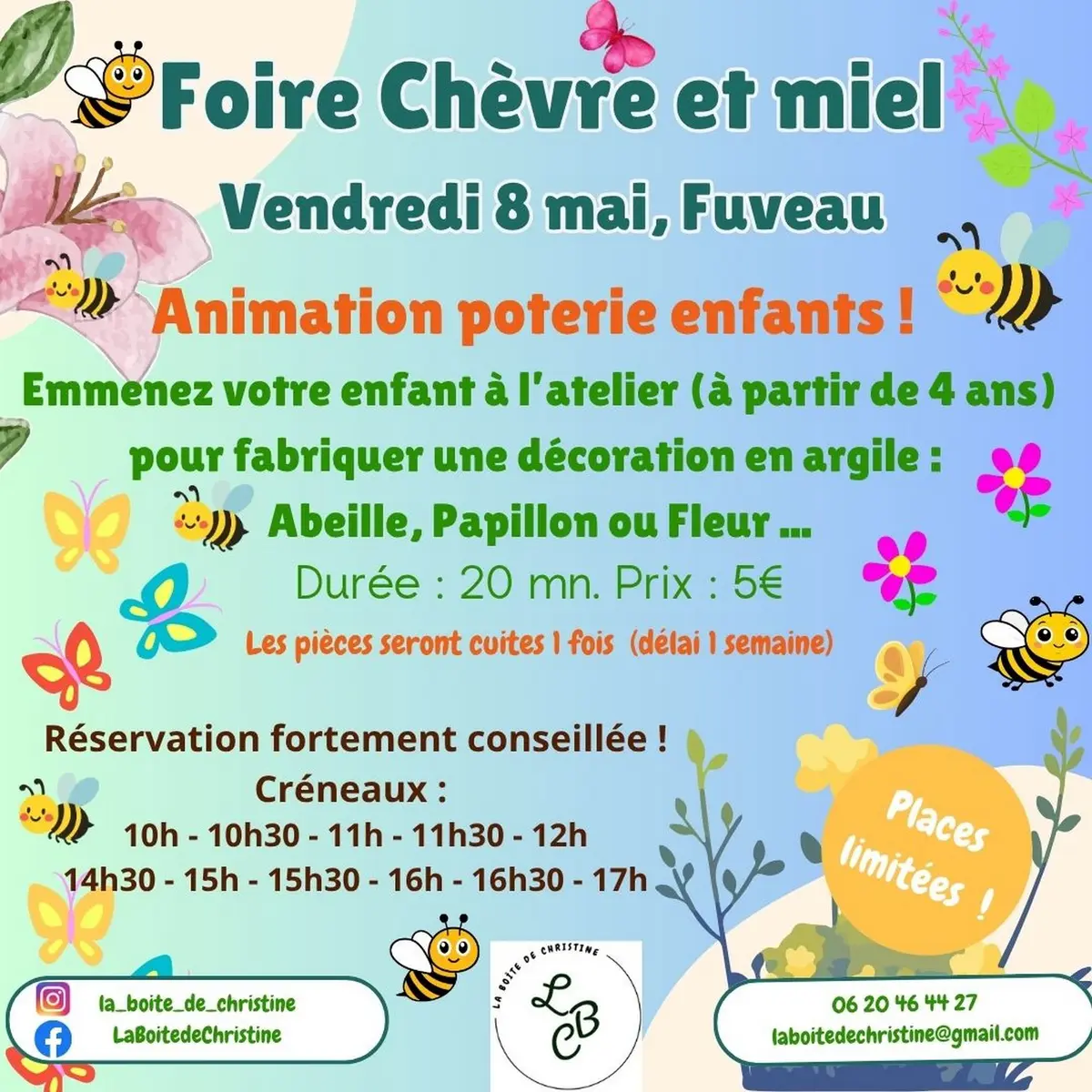 Emmenez votre enfant à l'atelier de Christine pour fabriquer une décoration en argile : abeille, papillon ou fleur...