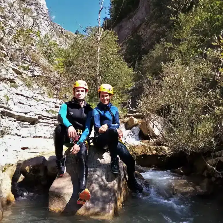 C’est un canyon très accessible mais complet : petits rappels faciles, un petit saut, et un grand toboggan. Le rythme est adapté pour que chacun puisse profiter de l’expérience à son propre niveau.