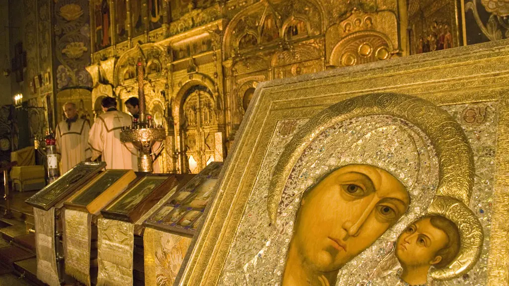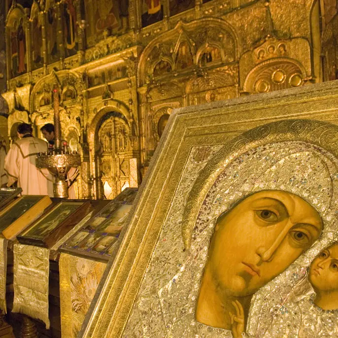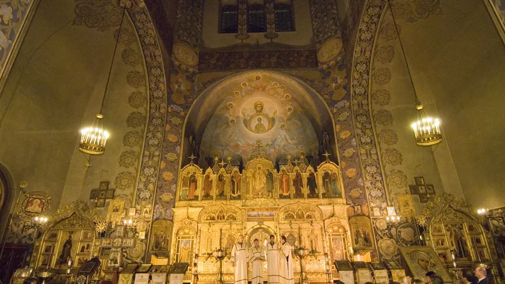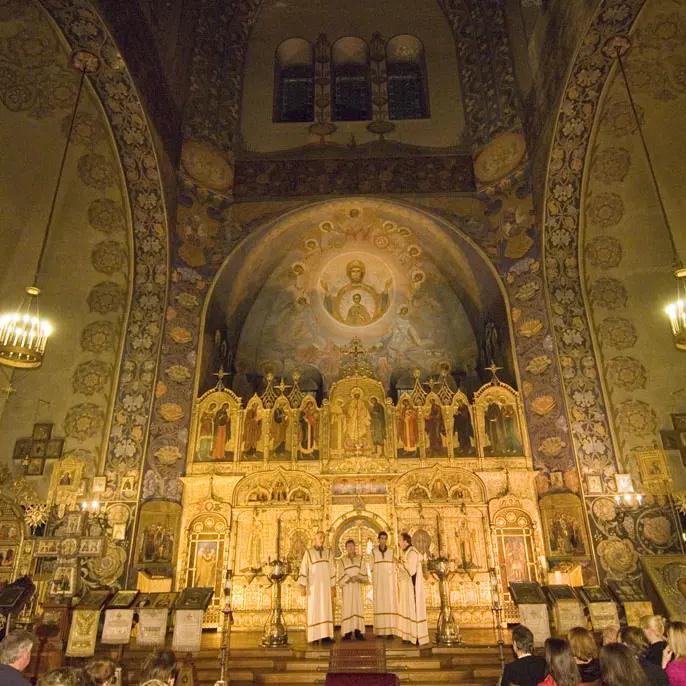 Inspirée du style des églises de Moscou, l'intérieur possède une décoration très riche, orné de multiples icônes, de fresques, de boiseries sculptées et d'une iconostase en métal repoussé et ciselé. La vocation première de ce site étant un lieu de culte, certaines règles doivent être respectées. L’entrée dans la cathédrale pourra être refusée en cas de non respect de ces principes. Tenue correcte exigée. Pour les hommes, la visite de la cathédrale torse-nu est interdite.