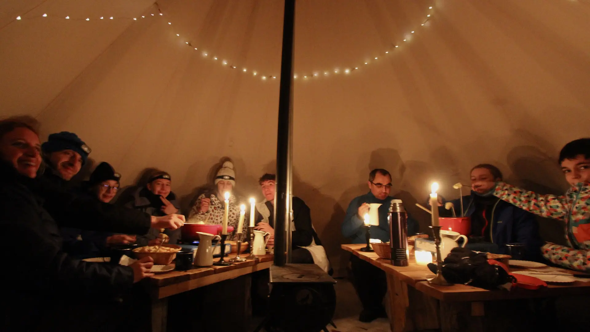 Chaussez nos raquettes à la nuit tombante, suivez-nous jusqu'au village trappeur, dégustez notre fondue locale dans notre camp trappeur.