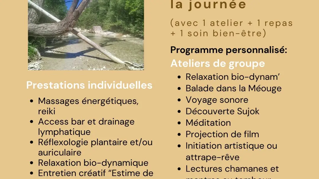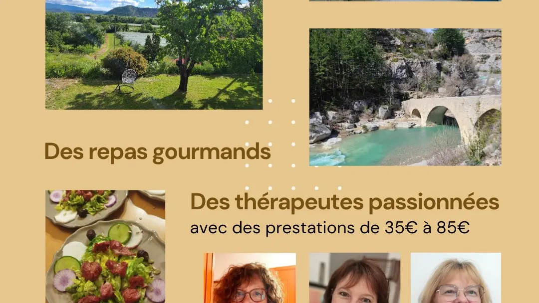 votre séjour bien-être aux portes de la Méouge ! Réservez 1, 2, 3 ou 4 jours, avec ou sans hébergement et lâchez prise dans un cadre plein de charme avec de belles rencontres, des ateliers, des prestations bien-être, des bons petits plats.