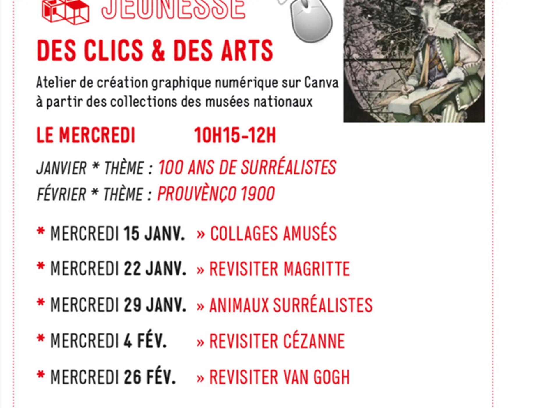 Atelier de création graphique numérique à partir des collections des Musées nationaux sur ordinateur ou tablette. Thème du mois : Prouvènço 1900. Au programme : Revisiter Cézanne le 4 Février, puis au tour de Van Gogh le 26 Février.