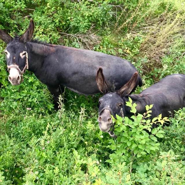 Balade ou rando avec bât (sans accompagnement) ou âne sellé, en 1/2 journée, journée ou plusieurs jours. 1h : 20 € - 3h : 50 € - Journée : 70 €