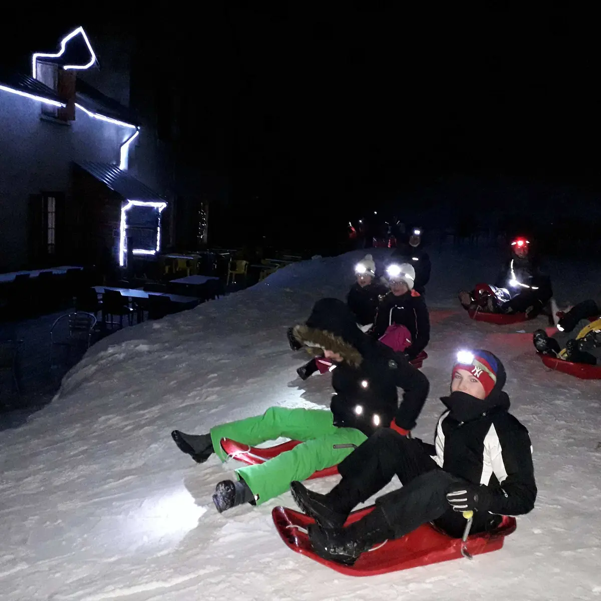 Lampes frontales fournies pour les descentes de nuit. Raquettes, bâtons et luges fournis également.
