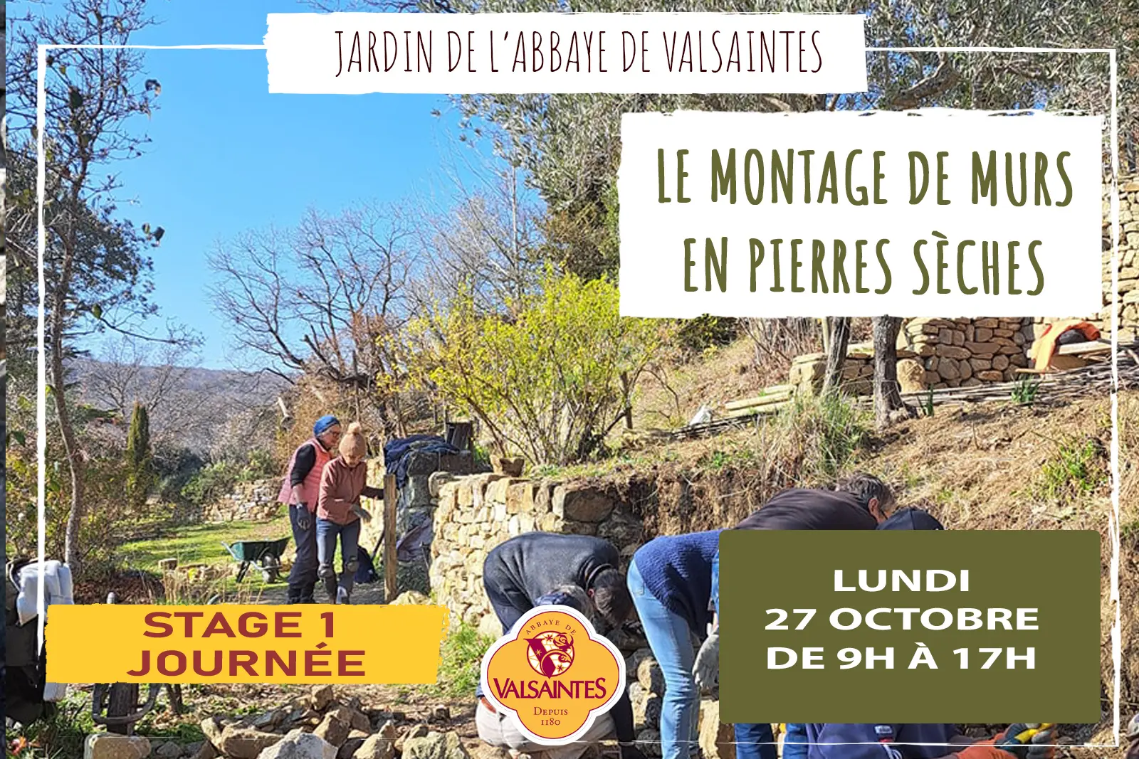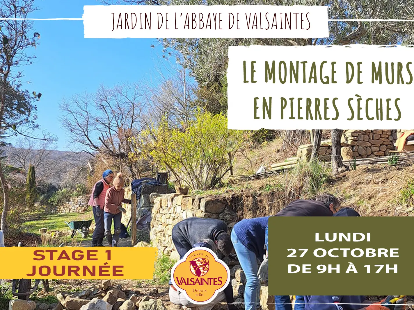 Après plus de 25 années de restauration de murets de pierres sèches dans le jardin de l’abbaye et une bonne expérience acquise, il est temps de transmettre.Assemblage, techniques.