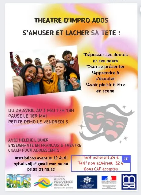 S'amuser et lâcher sa tête, dépasser ses peurs, oser se présenter, apprendre à écouter, avoir plaisir à être en scène. Ce stage d'impros théâtrales s'ouvrent à tous les ados. En collaboration avec l'OIJS et d'hélène Liquier enseignante et coach pour ados