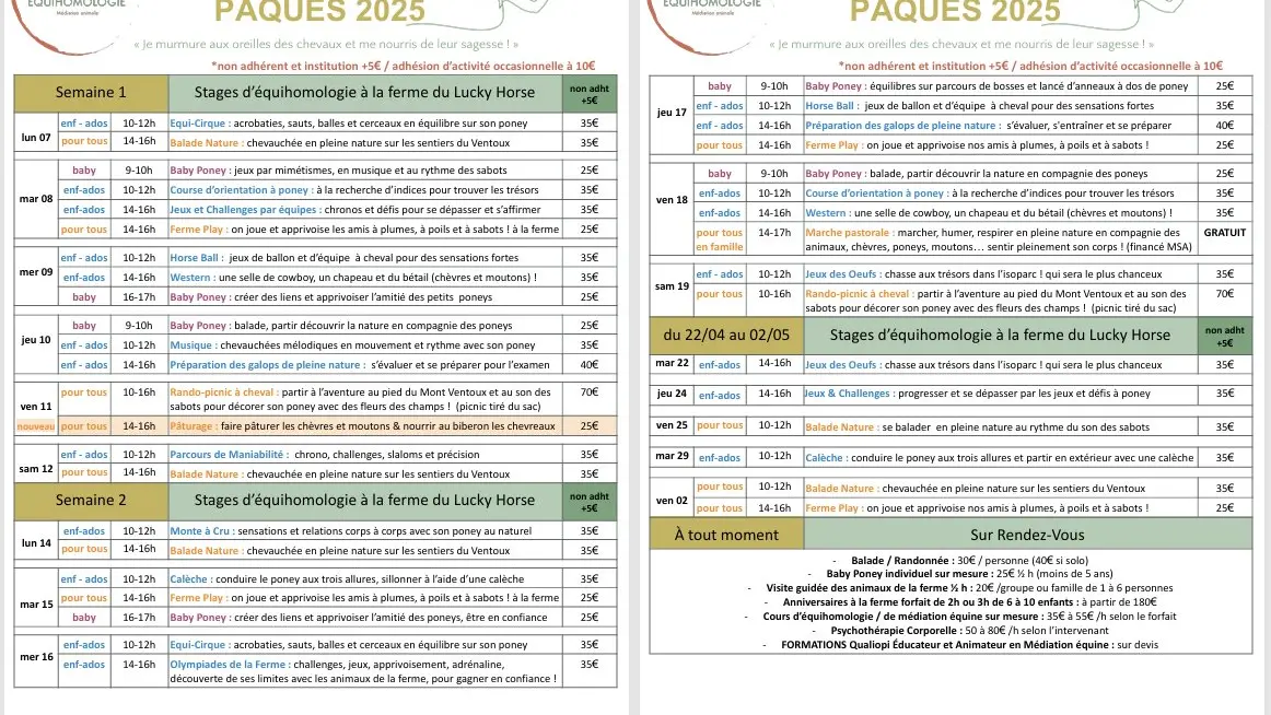 Pour progresser ou découvrir une nouvelle approche, la ferme Lucky horse vous propose à chaque période de vacances scolaires un programme d'activités ludiques et sportives : Baby Poney, Equi-Cirque... Programme détaillé disponible sur la page Facebook.
