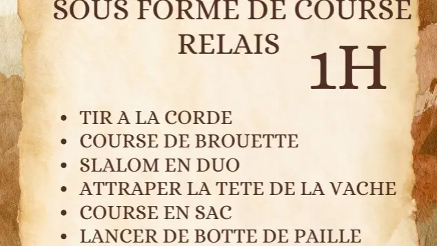 1h de Olympiade (tir à la corde, course de brouette, slalom en duo, attraper la tête de la vache, course en sac, lancer de botte de paille, tir à l'arc, course de cheval en bois, course à travers les pneus).
