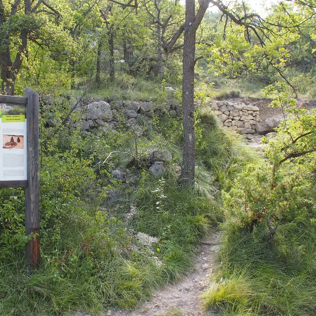 L'itinéraire vous conduira dans un premier temps à Cabanon Pointu, nom donné aux cabanes en pierres sèches (visibles à cet endroit), construites entre le XVIIème et XIXème siècle, qui témoignent aujourd’hui de l’histoire agricole du pays de Forcalquier.