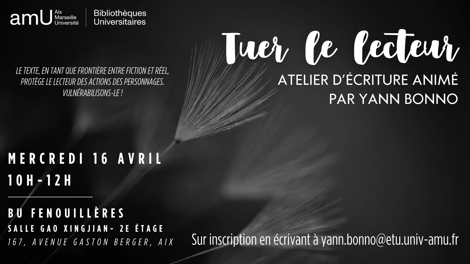 Atelier d'écriture ouvert à tous animé par Yann Bonno, étudiant en master Création littéraire à Aix-Marseille Université.