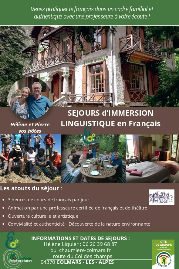 Hélène Liquier enseignante et coach de vie vous propose des séjours: Français langue étrangère, pour apprendre le français en immersion. Formules possible avec hébergement. Tout au long de l'année sur demande à Colmars ou à Whir au Val dans le Ht Rhin.