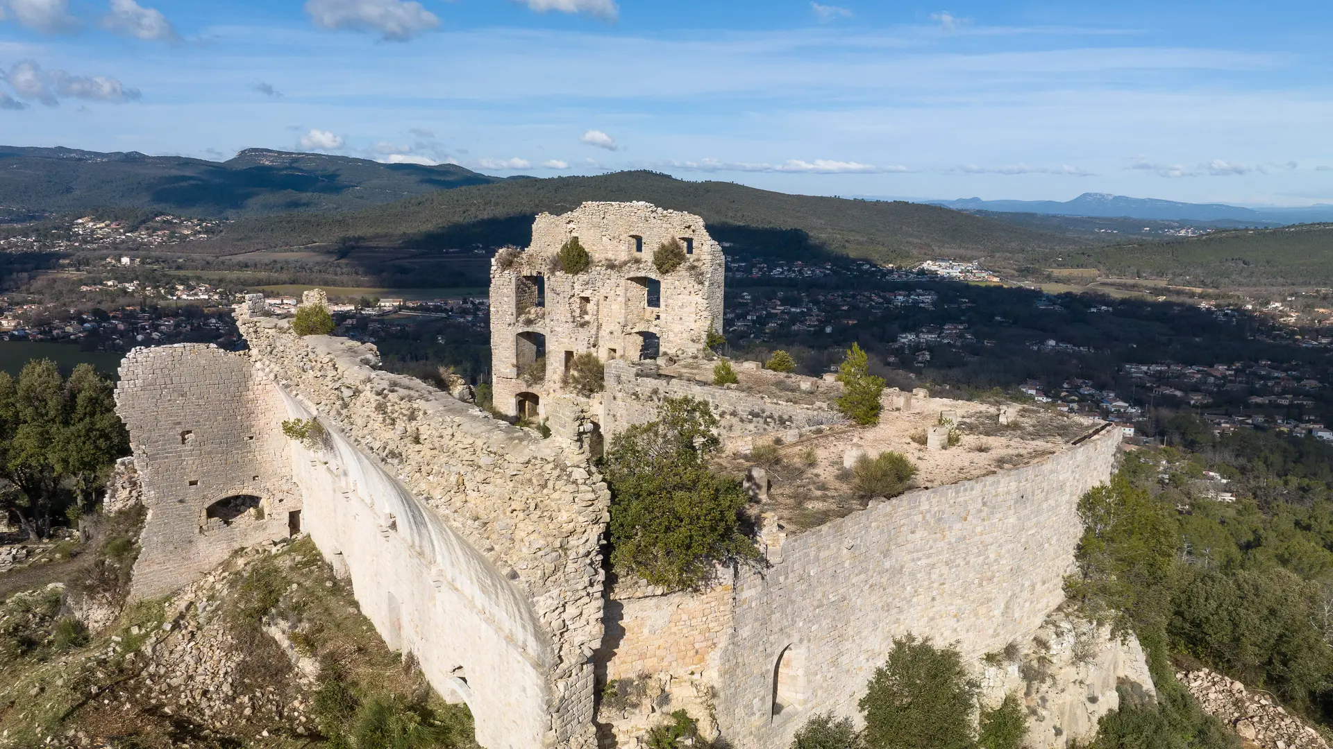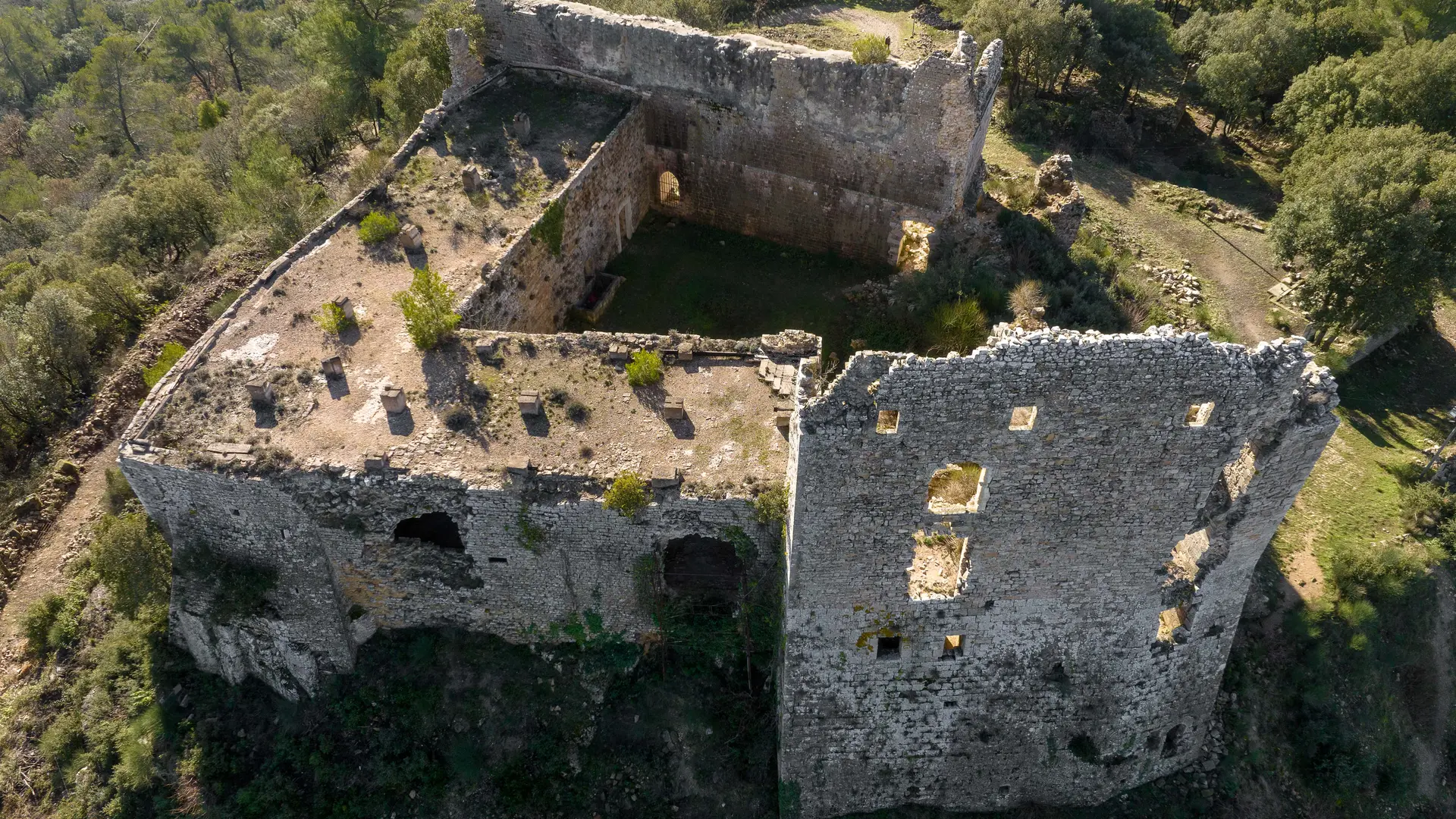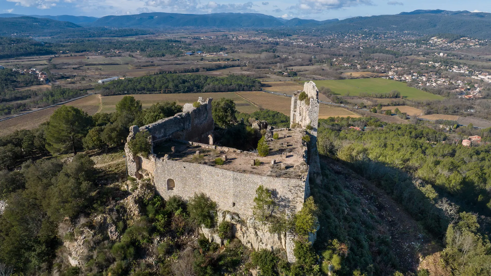 Le sommet du piton est entièrement entouré d'un mur d'enceinte qui renferme le château et le village, un profond fossé (douve sèche) complète le dispositif de défense. Bâti au XIIIème siècle, fortement remanié au XVème siècle, il est abandonné définitivement au cours du XVIIème siècle. Dans l'intervalle, la seigneurie demeure 320 ans dans la famille d'Agoult, puis devient le fief militaire d'Hubert de Vins, chef du parti catholique, pourchassé par les protestants. En 1621, le marquis de Vins abandonne la forteresse. Le château passe à la famille de Pontevès grâce à une alliance en 1781. Début 1900, le dernier des Pontevès vend le château à un riche négociant, Monsieur Dhorsner. Le château devient une carrière de pierre. En 1978, Monsieur Borg, propriétaire suivant, cède la colline du Castellas à la commune, pour le franc symbolique. Le château est alors inscrit à l'inventaire des monuments historiques.