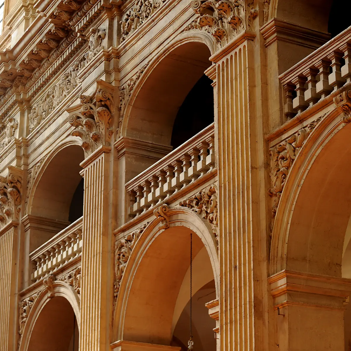 La haute façade appelée à recevoir une décoration baroque, reste inachevée.