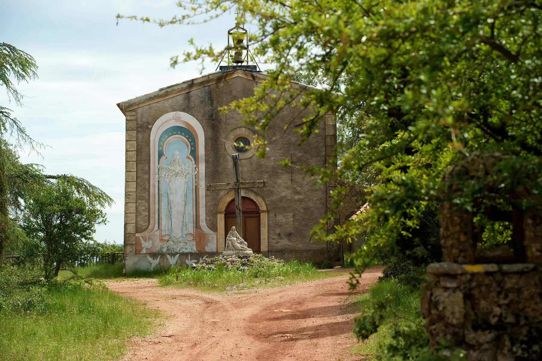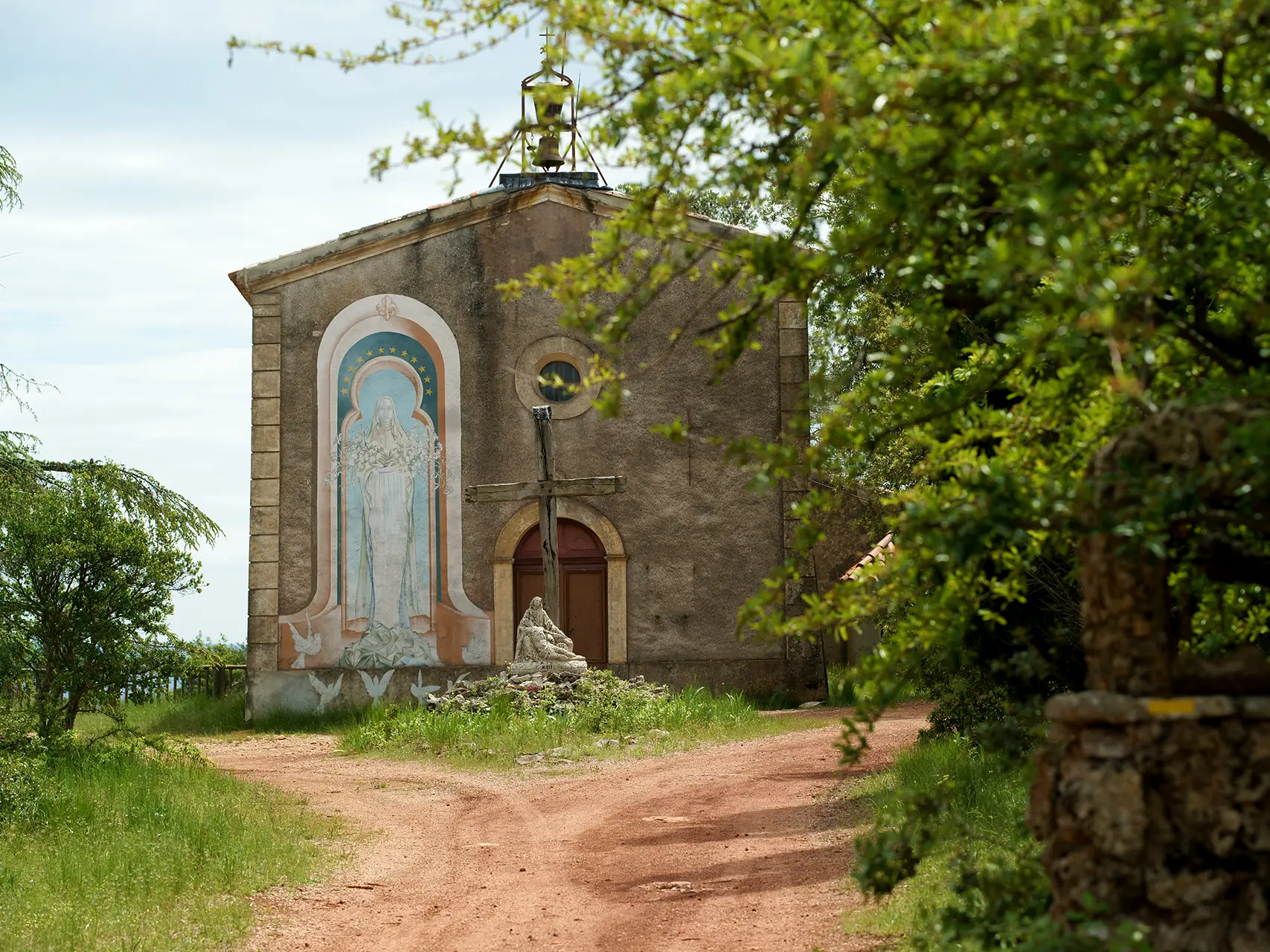 Une fresque peinte orne la façade principale. Elle représente une Vierge auréolée portant un bouquet de fleurs, à ses pieds des colombes. Devant la chapelle se dresse une pietà (Marie tenant son fils mort dans les bras). Sur le pan ouest de l'abside, une seconde fresque figure une croix et son chapelet. La chapelle renferme de nombreux ex-voto.