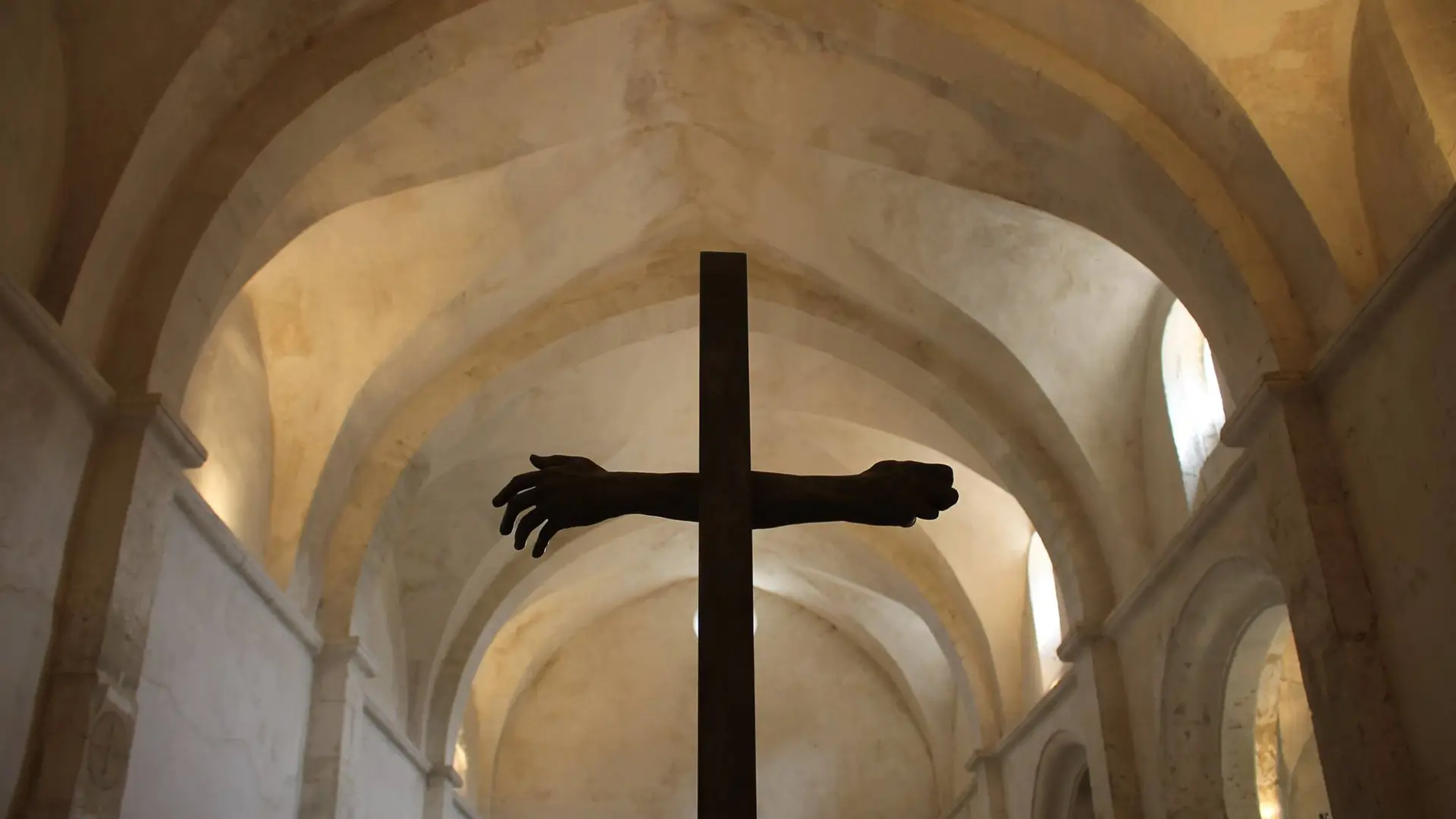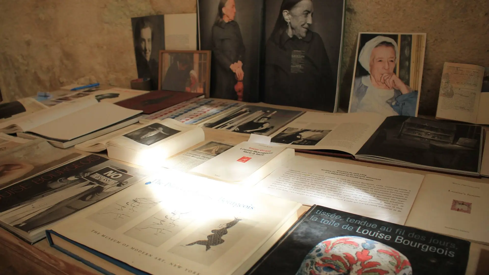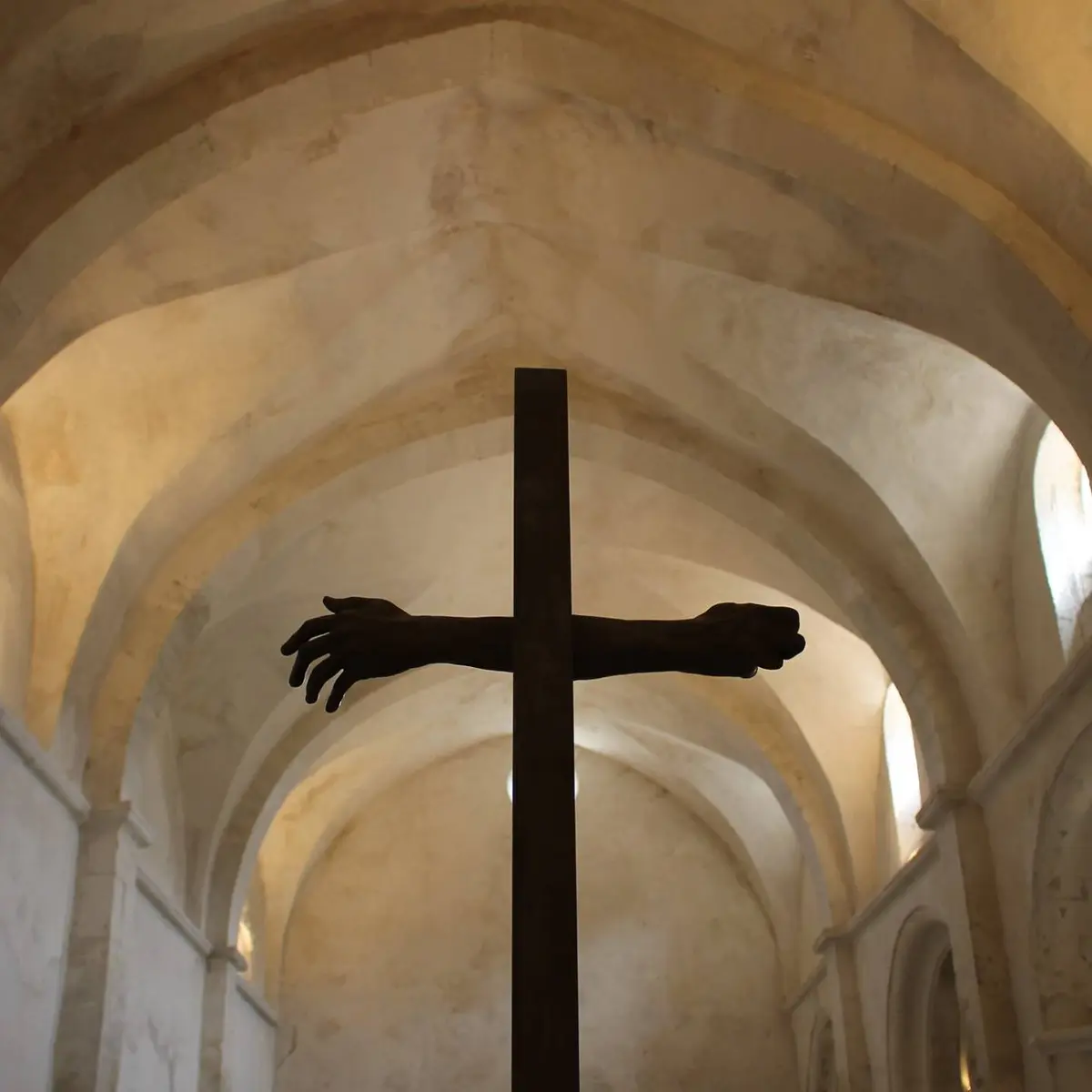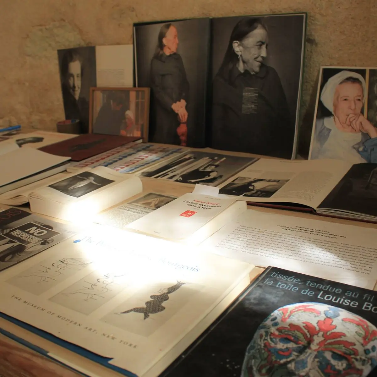 ... une sculpture des mains jointes pendant la prière, une vitre bleue figurant le ciel, une lumière rouge : le cœur, un Christ en chiffons, puis une araignée en bronze symbolisant la mère, enfin la Vierge et l’Enfant, ...