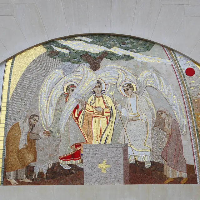 L'église de la Sainte famille se caractérise par une coupole monumentale, en pierres taillées par les compagnons du devoir et recouverte de cuivre sur sa partie extérieure. La porte d'entrée et le tympan sont découverts d'une mosaïque réalisée par Le Père jésuite Marko RUPNIK, artiste qui a réalisé de véritables chefs d'oeuvres notamment à Lourdes, Fatima et San Giovanni Rotondo.