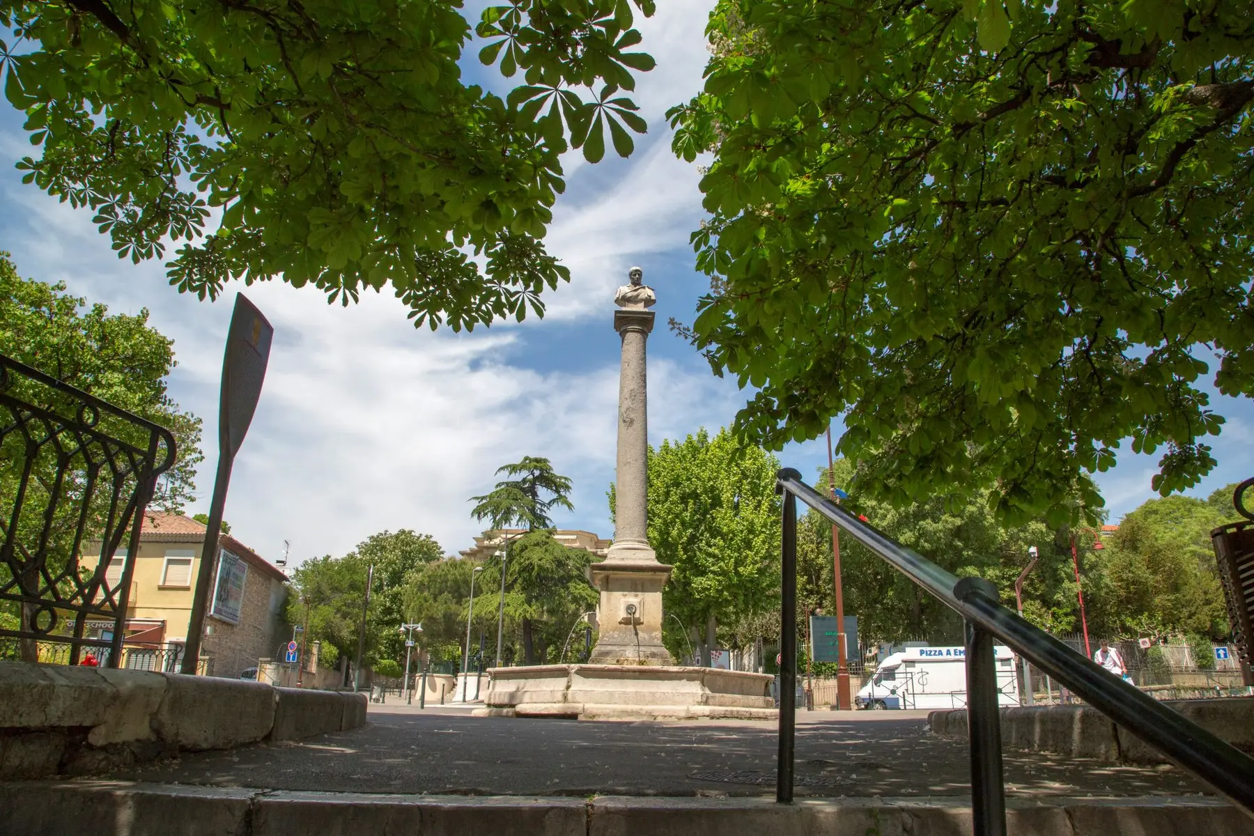Le monument fait preuve d'une grande élégance de par ses quatre canons qui laissent couler l'eau symétriquement dans la vasque géométrique à deux niveaux et la colonne, prise des vestiges romains du IVe et Ve siècle, semble chercher à détrôner les arbres avec comme capitaine, Granet en son sommet.