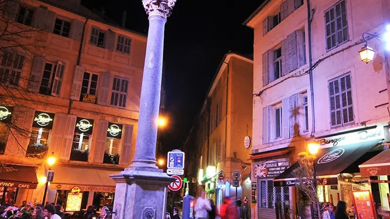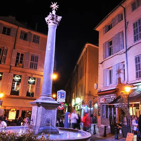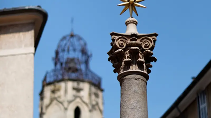 Cette fontaine a été construite en 1620. Deux siècles après, en 1820, elle est reconstruite entièrement. C'est alors qu'on la décore d'une colonne romaine provenant du palais comtal, sur l'emplacement de l'actuel palais de justice.