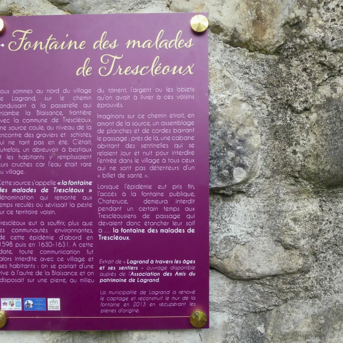 Inestimable ressource, la Fontaine des malades de Trescléoux est l’une des plus anciennes de Lagrand. Sa source coule au nord, près de la Blaisance et face au plateau de la Garenne. Son Nom évoque une des périodes dramatiques de l’histoire de la contrée.
