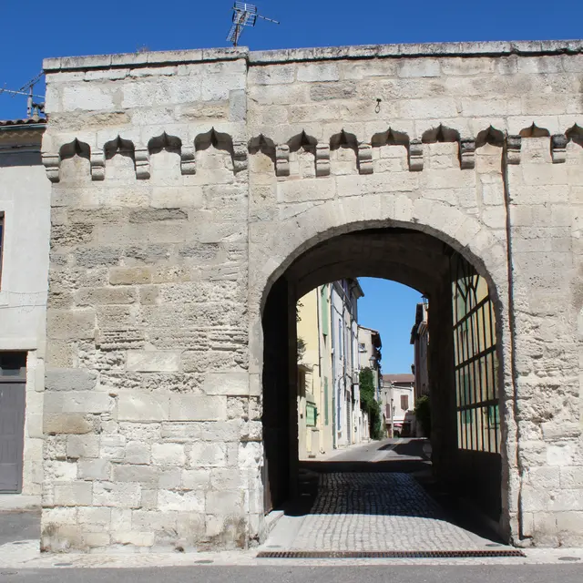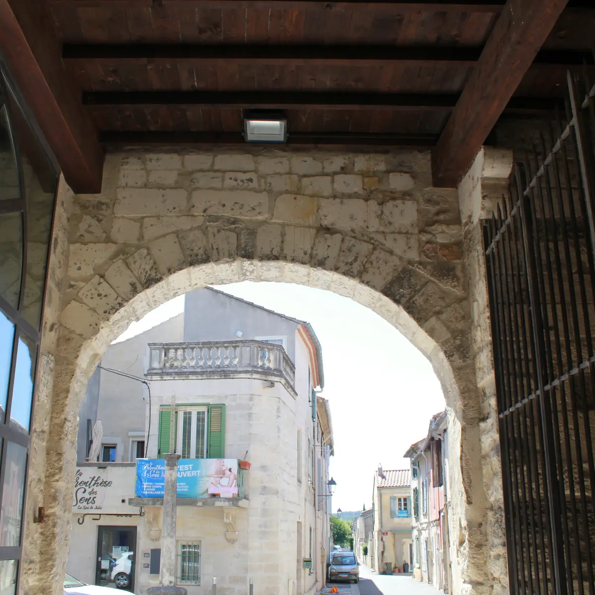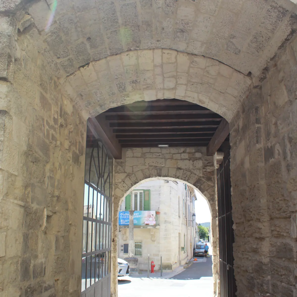 Ancienne porte de ville et restes des anciens remparts. Passage ouvert en plein cintre, décoré de faux mâchicoulis, vestige du chemin de ronde.
