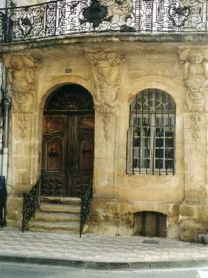 Façade de l'hôtel Garcin classée monument historique: 3 atlantes supportent un balcon avec une grille en fer forgé. Bâtiment du XVIII ème siècle qui aurait été construit pour le compte de la famille de Sade. La famille Garcin, négociants en huile et en savon, en a été propriétaire de 1830 à 1950.