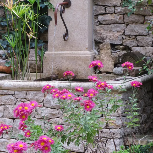 Depuis le portail d’entrée, l’allée pietonne donne accès au verger, longe poiriers et pommier en cordons, cerisier et plants de vigne, une bordure de vivaces et rosiers. Au fond un poulailler permet d’exposer les Poteries de l’Atelier. Passé le portillon, derrière une haie de lauriers tin, l’allée centrale bordée de vieux ifs taillés en topiaires, distribue plusieurs espaces: L’amphithéâtre de verdure avec sa rocaille en sec,( sauge, plantes aromatiques, sedums divers vivaces) la tonnelle des rosiers grimpants, le patio des roses, la cabane de lecture, le jardin de l’Atelier ombragé par un micocoulier centenaire, enfin la serre (crée au début du 20eme siècle) où vous pourrez découvrir les poteries de l’Atelier du Mille Pattes.