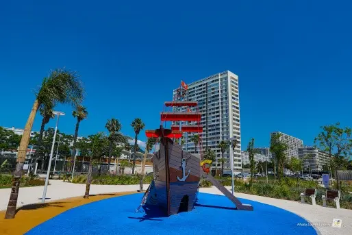 Le jardin du Port Marchand comprend un jeu d’enfants en forme de bateau, une terrasse en front de mer, un espace de pique-nique et une promenade le long du littoral.