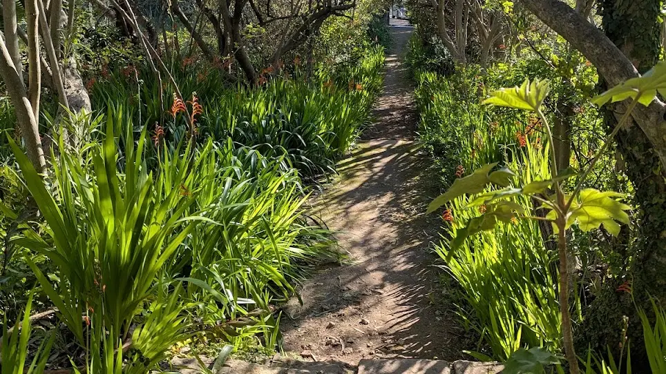 Une allée majestueuse de vieux lauriers roses monte vers les platanes centenaires de la terrasse. Avec ses différences de niveaux et ses nombreuses pièces d'eau, bassins, fontaines ou étangs, ce jardin d'agrément constitue un exemple intéressant de système d'irrigation par gravité.