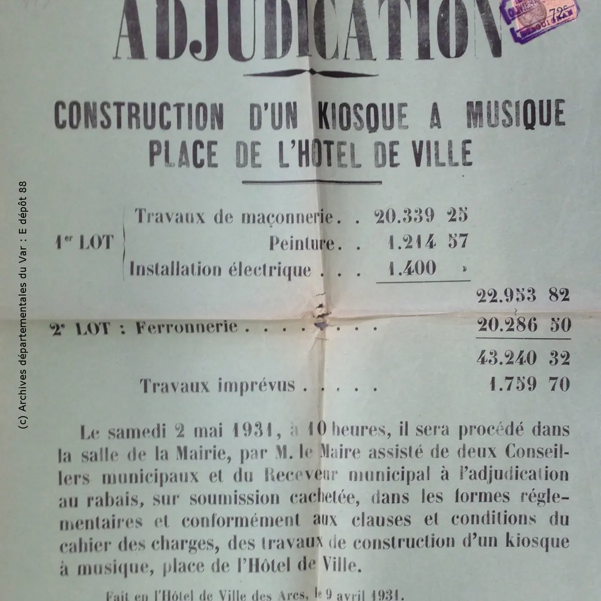 Le 8 mars 1931, une délibération municipale nous apprend que la souscription a réuni près de 23000 francs grâce à l’appui financier de plus de 500 souscripteurs, que « la musique est un art qui a été par trop délaissé pendant de nombreuses années » et que « l’édification du kiosque sur la place de l’hôtel de ville s’impose ».