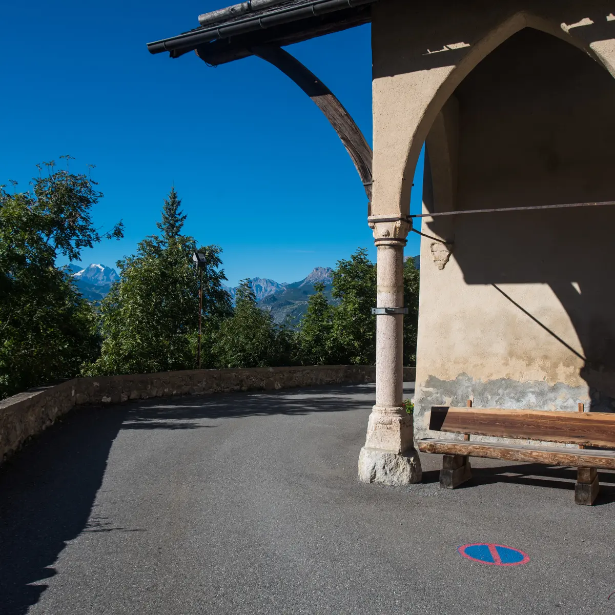 Le Portail, déplacé de sa position initiale, est en plein cintre, avec une double voussure encadrant un tympan simple; des colonnettes encadrent la porte. Si le piédroit est simple, sans ornement, l'entablement, lui porte de chaque côté quatre coeurs (total huit coeurs rappelant le Christ passion du Christ, Sacré Coeur, âme,..). Sur une face, il y a également trois coquilles : deux identiques, une autre, plus petite, semble avoir été rajoutée plus tard : ces coquilles sont les signes de reconnaissance des Pèlerins de Saint Jacques de Compostelle, dont un chemin longeait la Durance (cf Chapelle Saint Jacques de Prelles, fresque d'Eygliers..)