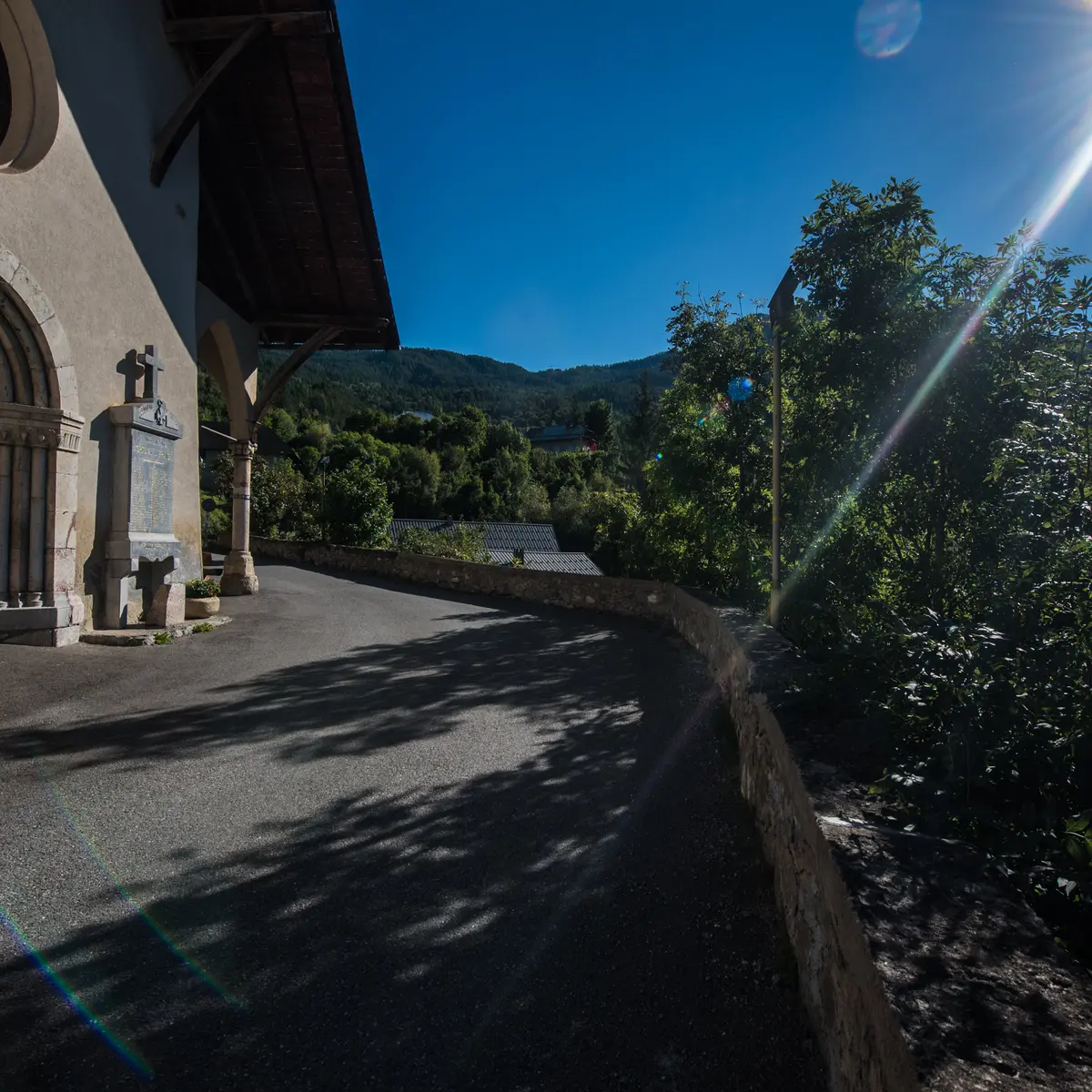 La Voûte (1830) : la nef a existé d'abord sans voûte. Une ouverture pour rosace est visible dans les combles. Une poutre sablière est cachée dans le mur, avec panne coupée visible de l'extérieur.