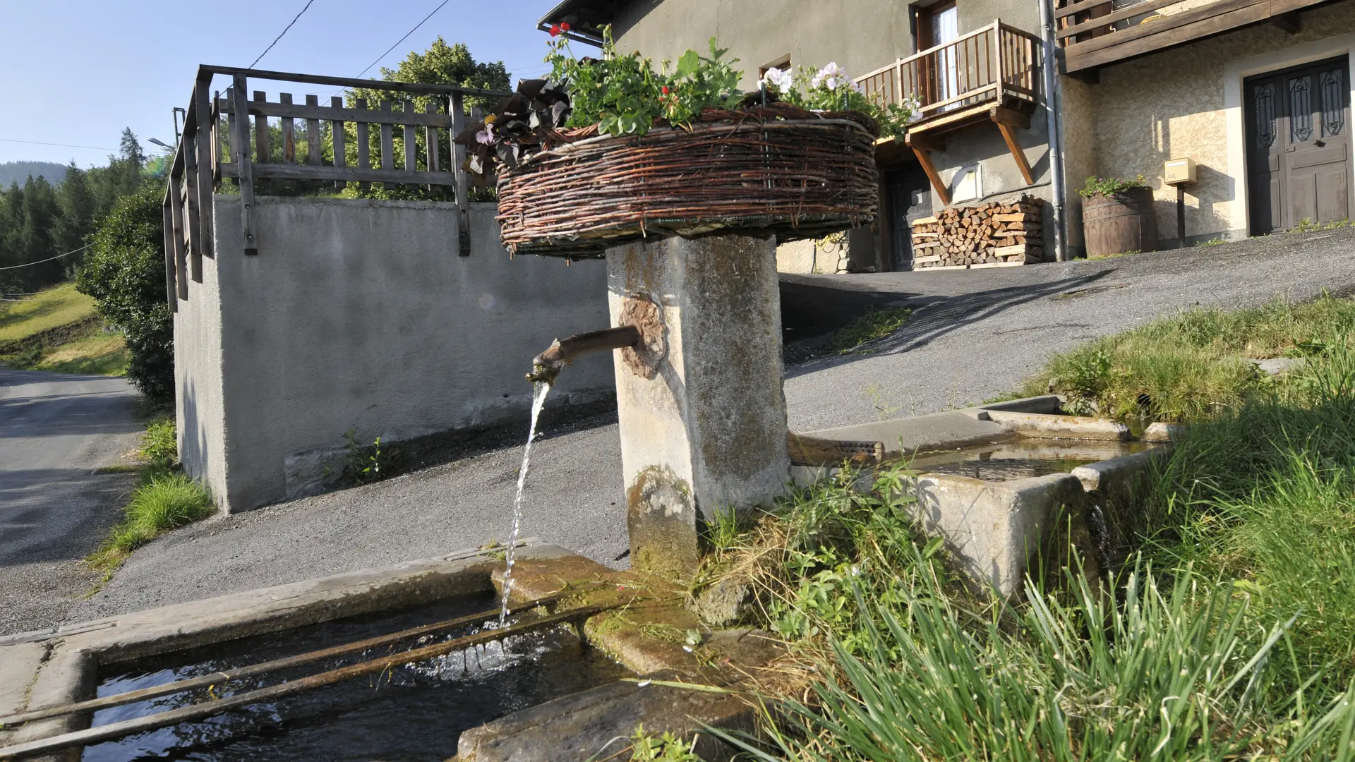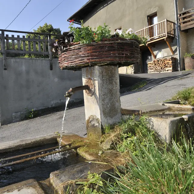 Au bourg, la fontaine du presbytère présente un bassin très ordinaire, mais l’arrivée d’eau, située dans un mur sous une voûte, est en bois et porte la “barbe” de mousse. Ce versoir se nomme en patois le “dusse”.