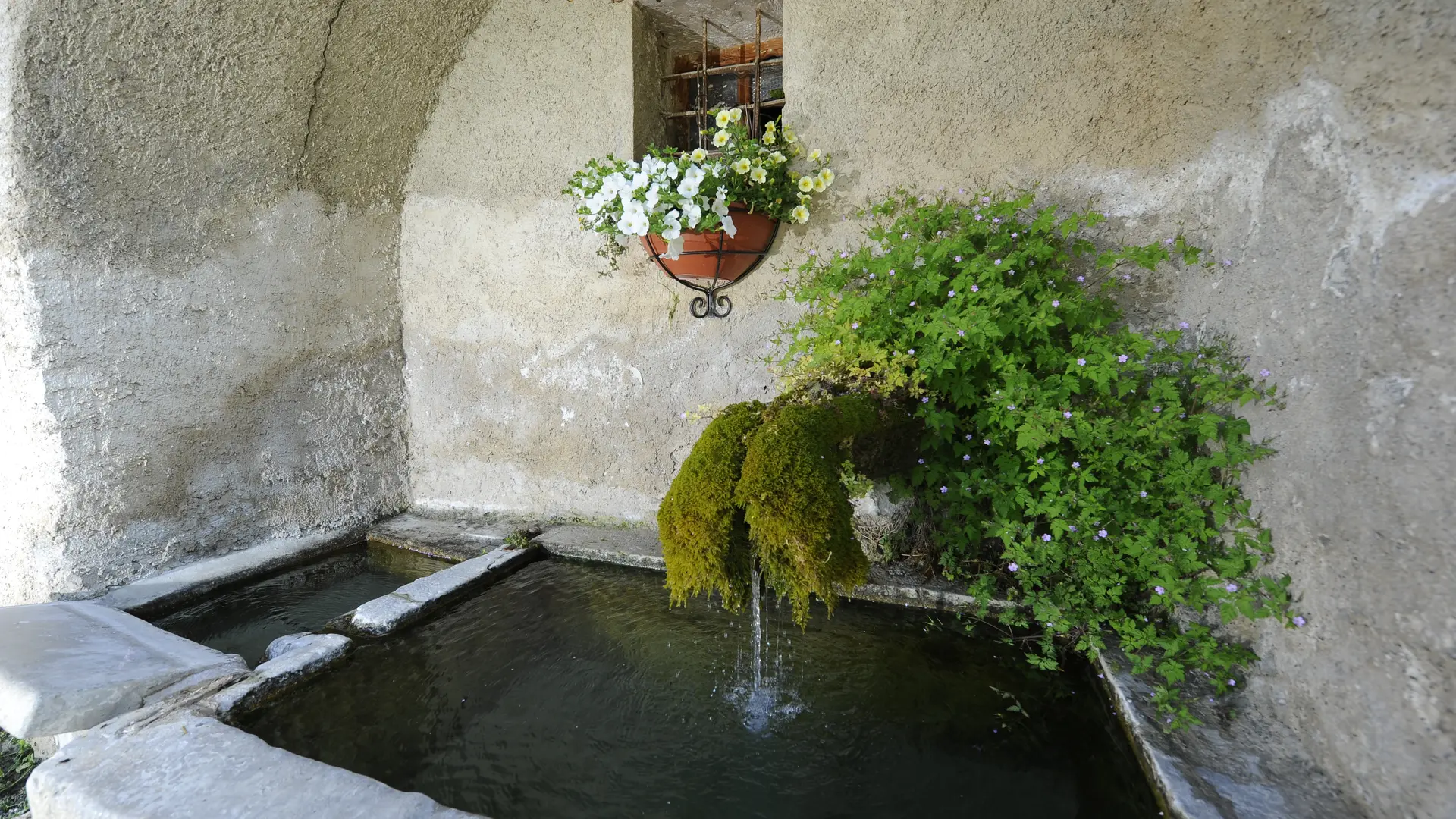 A la Rua, borne-fontaine avec versoir métallique, bassin ancien et lavoir moderne.