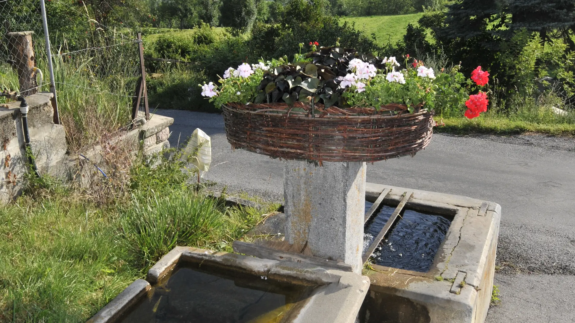 Aux Fourniers, on mélange les genres. Le versoir antique fixé sur une colonne carrée, déverse l’eau dans un bassin circulaire et cerclé, en pierre. Le lavoir est en béton. Fontaine bucolique au milieu des mélèzes.