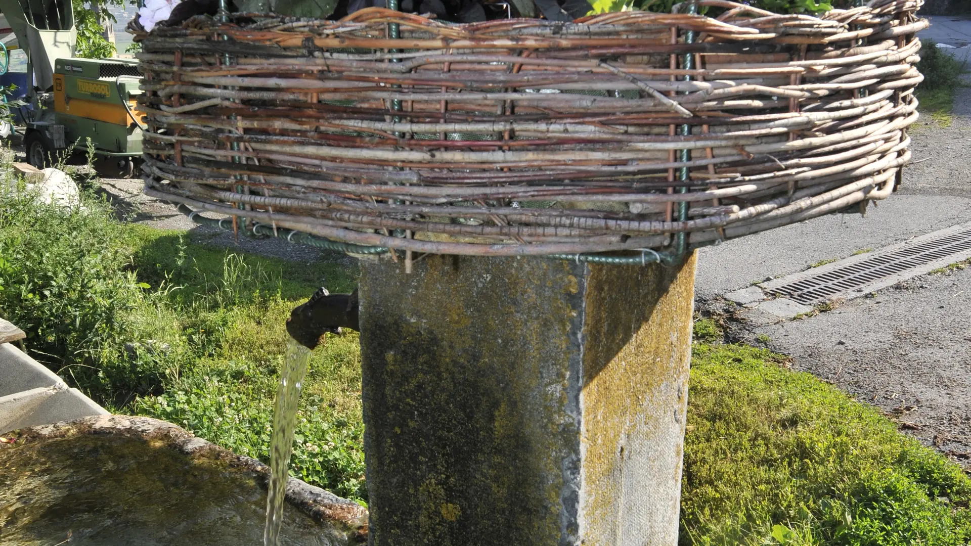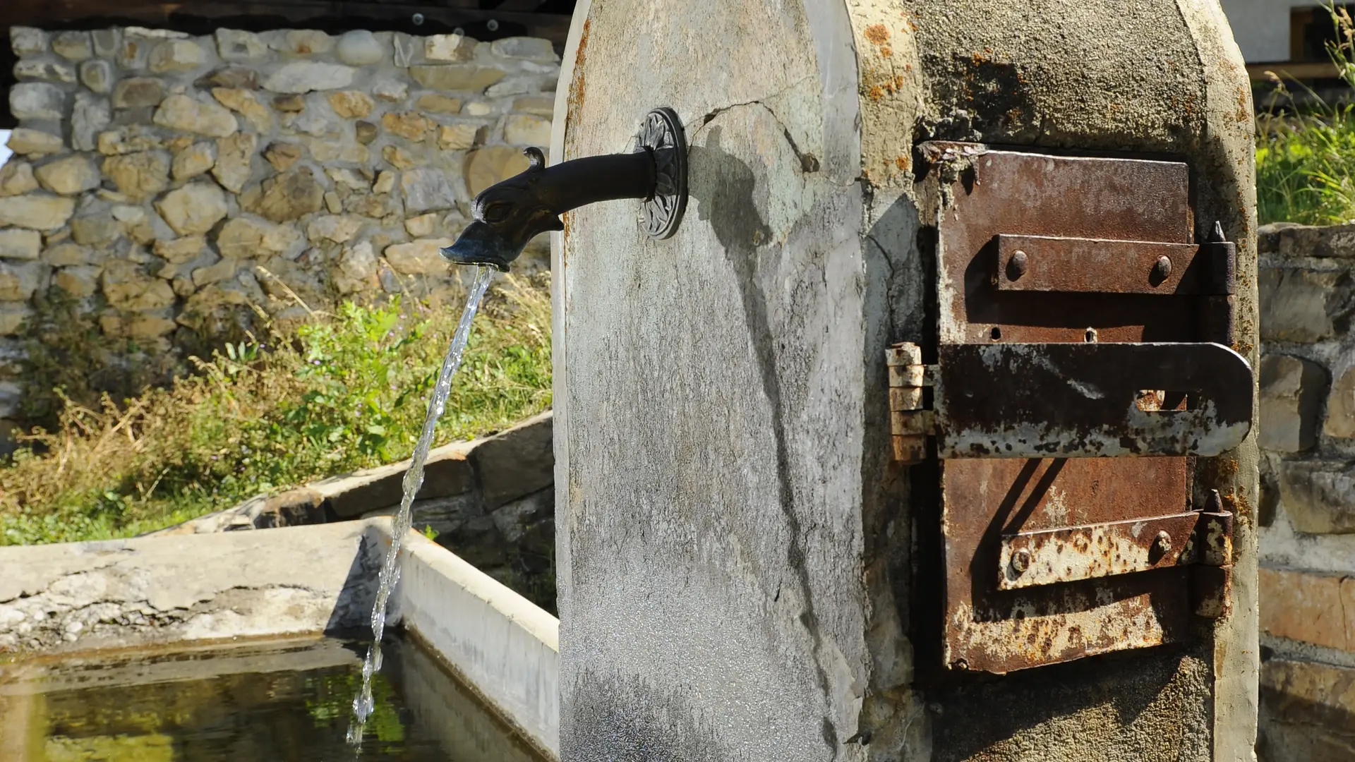 Aux Bruns, on retrouve la borne colonne avec versoir métallique à tête de dragon et bassin rectangulaire, le tout en pierres.