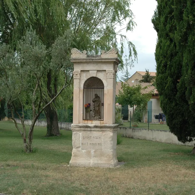 Edifice de section rectangulaire en pierres de taille de grand appareil. Au-dessus d'un soubassement de faible hauteur, un entablement mouluré supporte une grande niche en plein cintre encadrée de pilastres à chapiteaux, soutenant une frise et une corniche surmontées d'un toit plat orné aux angles de consoles en volutes en forme d'acrotères. Une grille de fer forgé avec imposte rayonnante protège la statue du saint. Sur le clef de voûte on peut lire la date de construction 1866, et sous la niche la dédicace "Saint Roch, priez pour nous".