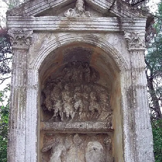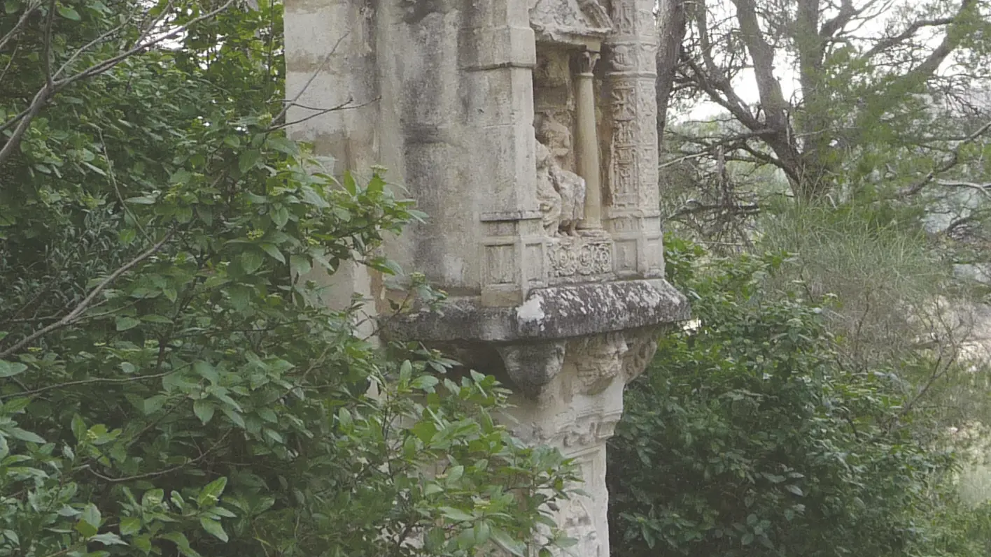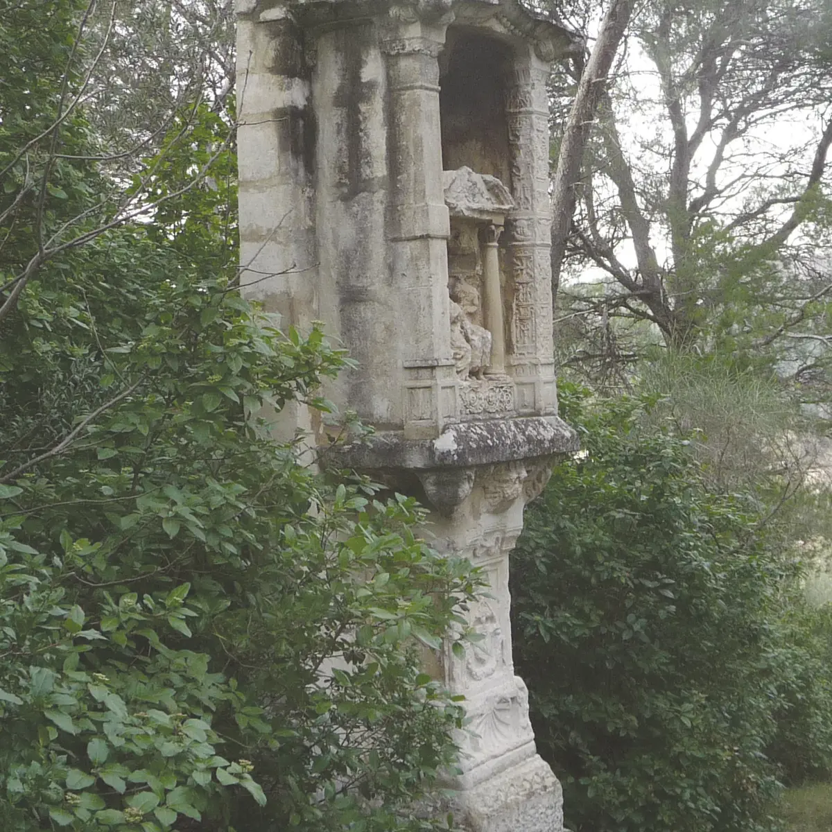 Il se compose d'un piédestal plus étroit que la niche qu'il supporte et l'ensemble de l'édifice est adossé sur un mur. La niche est encadrée de deux piliers. Celui de droite est très ouvragé. À l'intérieur de la niche, un bas-relief représente quatre personnes dont les têtes ont été mutilées, probablement à la Révolution. Deux belles figures d'anges animent le fronton supérieur.