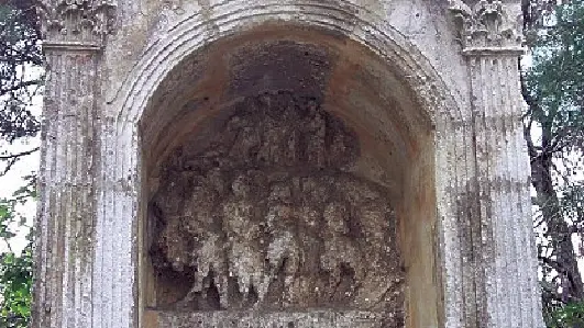 Son socle bas supporte une grande niche au fond de laquelle une sculpture très mutilée représente la Vierge et l'Ange Gabriel.