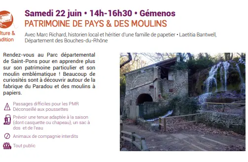 rendez-vous au Parc départementale de Saint Pons pour en apprendre plus sur son patrimoine particulier et son moulin emblématique ! beaucoup de curiosités sont à découvrir autour de la fabrique du Paradou et des moulins à papier
